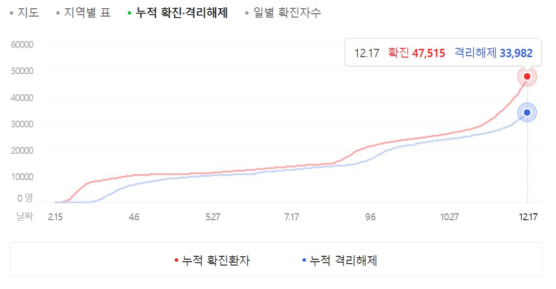 12월 18일 기준 국내 코로나 19 신규확진자 수가 1,062명을 기록하며 사흘 연속 1,000명대를 보였습니다. 이 중 국내 발생은 1,062명, 해외 유입은 26명입니다. 18일 기준 누적 확진자 수는 47,515명에 달합니다.