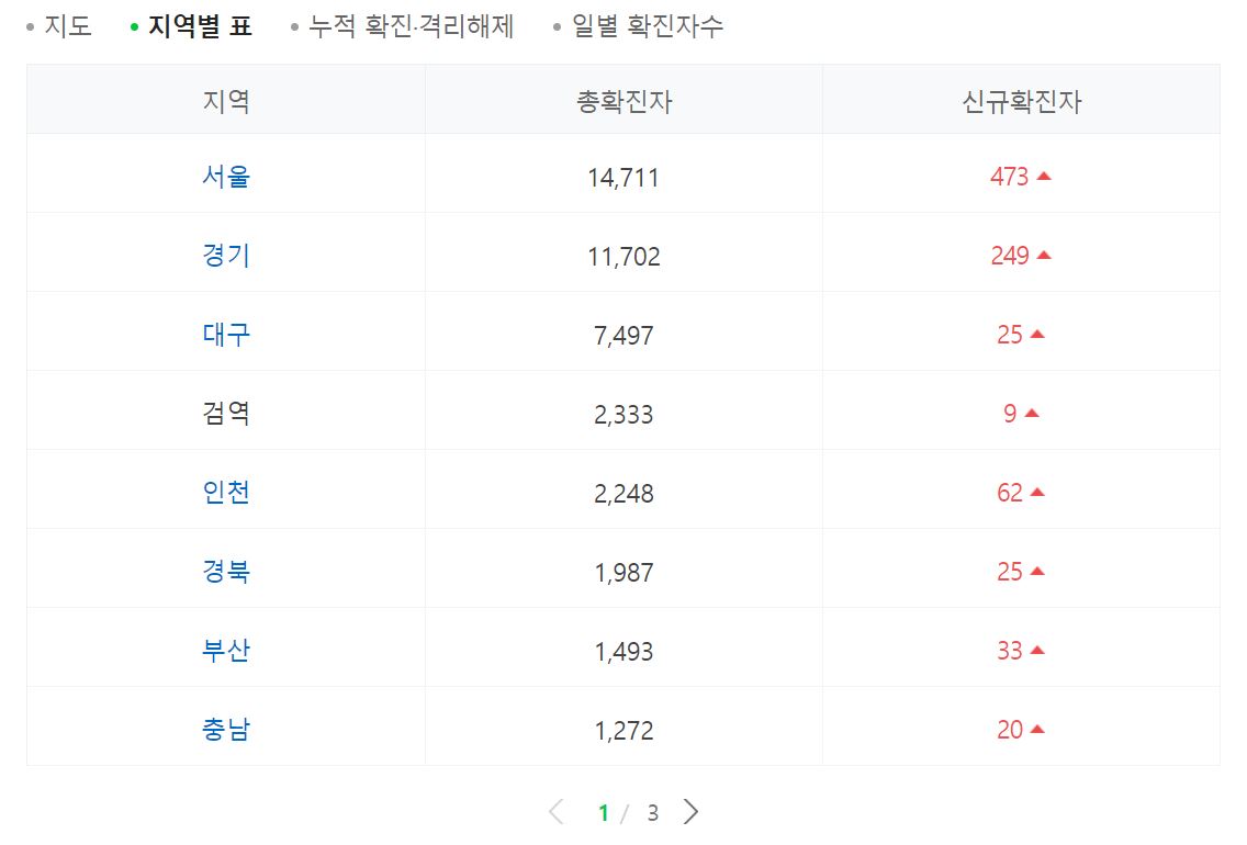코로나 19 사망자는 15명을 기록했으며, 지역별 코로나 확진자를 살펴보면 서울 470명, 경기 244명, 인천 62명, 강원 55명, 경남 49명, 부산 33명, 전북 29명, 대구 25명, 제주 24명, 경북 23명, 충남 19명, 충북 14명, 광주 13명, 울산 5명, 전남 4명, 대전 3명입니다.