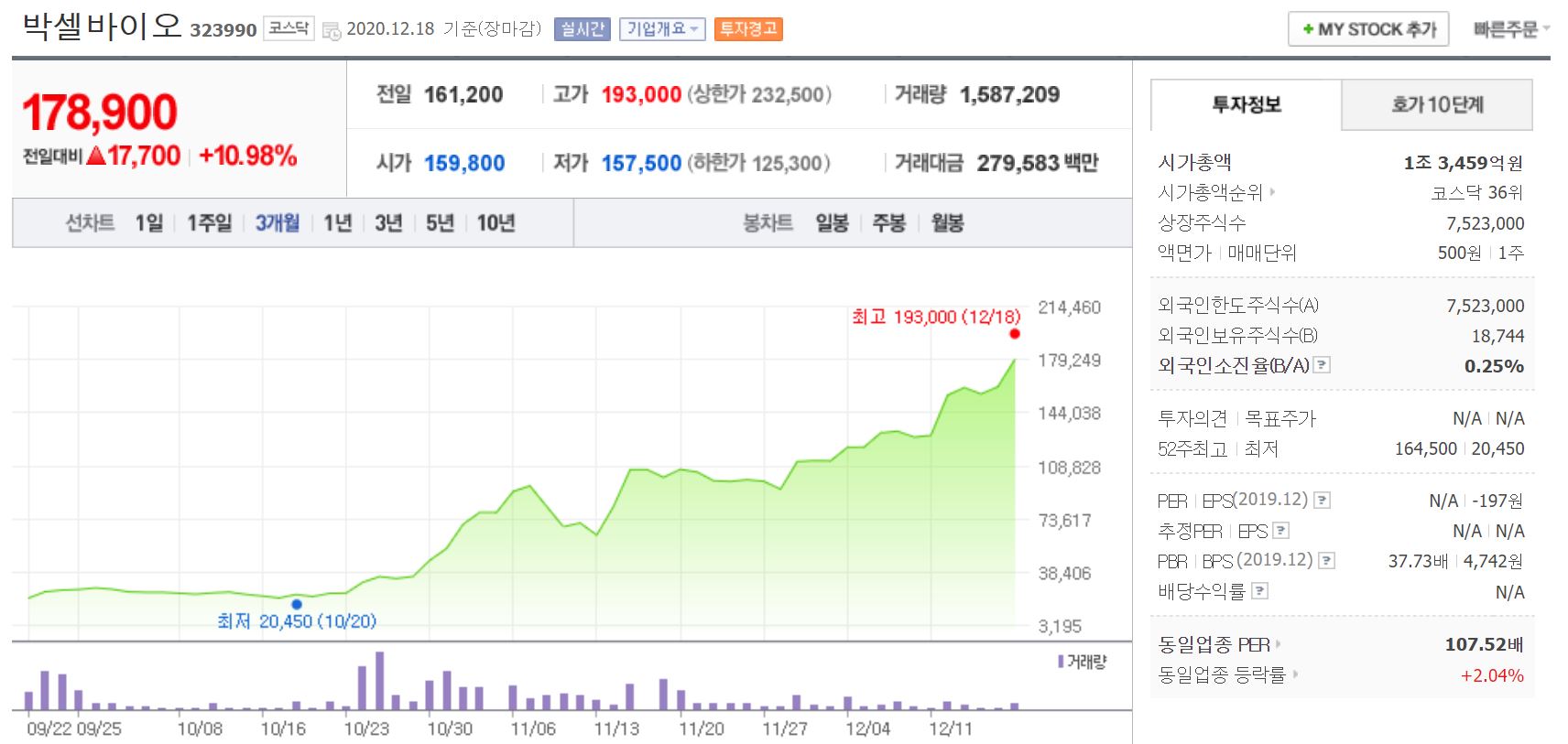 9월 상장을했고 경쟁률도 부진했으며 상장 직후 주가하락으로 시작했지만 신약 개발 기대감에 현재 공모가 대비 4~5배가 오른 상황입니다.