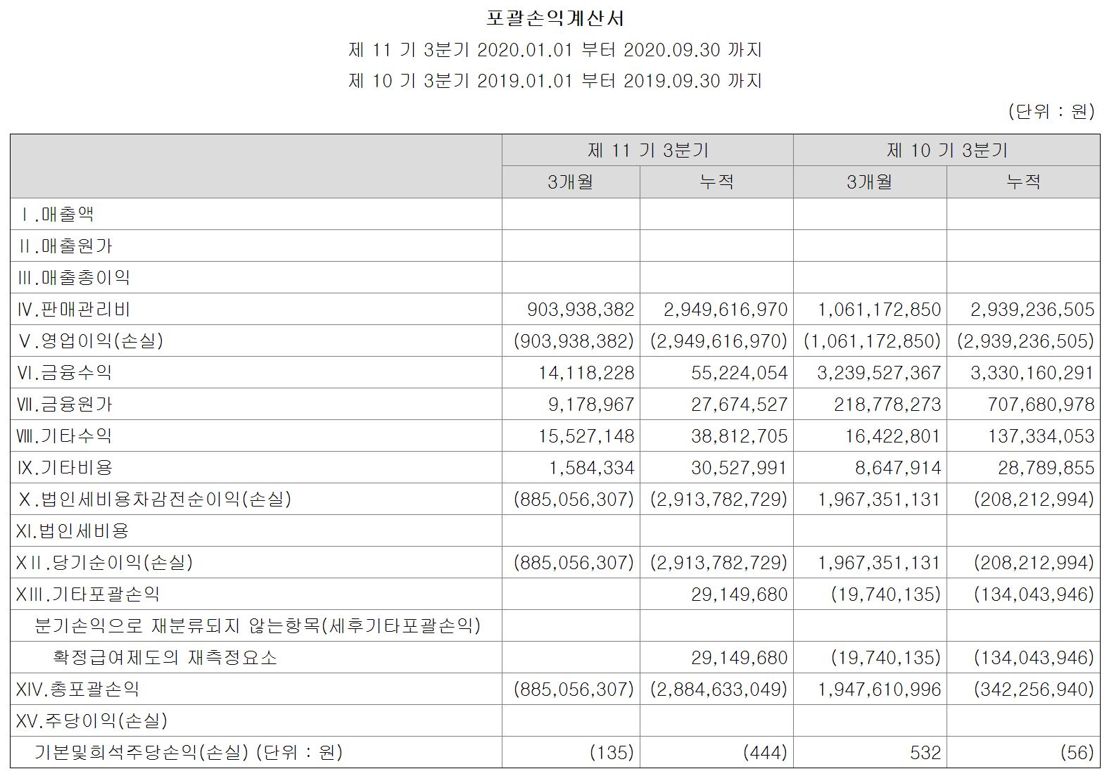 매출 : 0원 / 영업이익 -20억 원 / 당기순이익 -20억 원