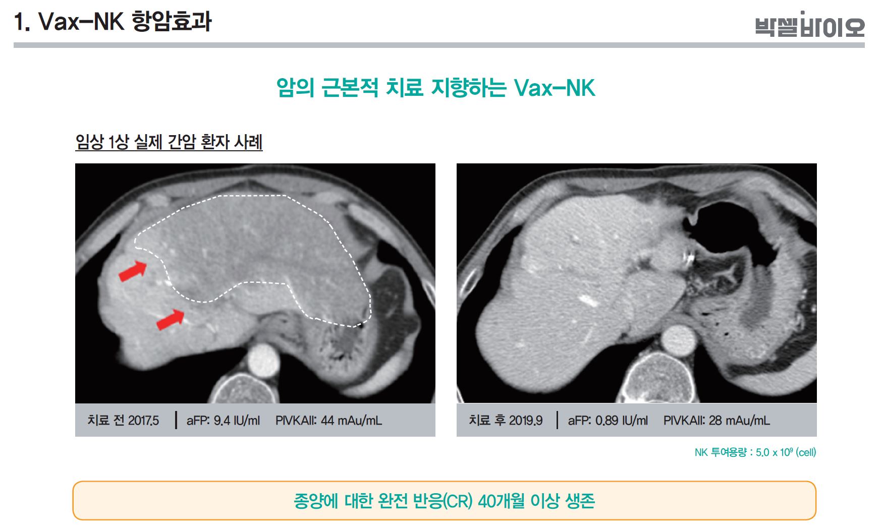 현재 진행 중인 임상 2상에서도 첫 환자부터 완전관해가 나타났으며 임상 2상에서는 1상보다 NK세포를 2배 가량 더 투여해 더 좋은 효과를 기대할 수 있을 것으로 내다보고 있습니다.