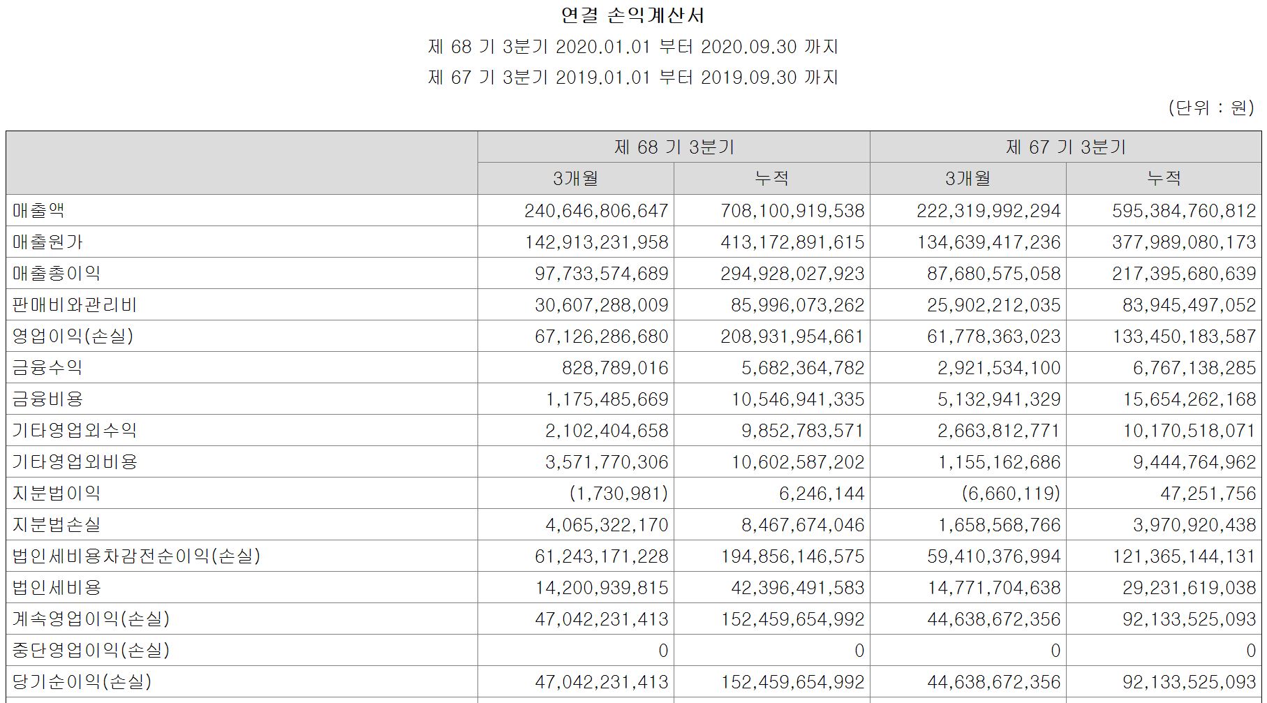 3분기 실적을 살펴보면 매출은 전년 동기 대비 8% 증가한 2,406억 원을 기록했으며, 영업이익은 671억 원을 기록하며 전년 동기 9% 증가하였으며, 당기순이익은 470억 원을 기록했습니다.