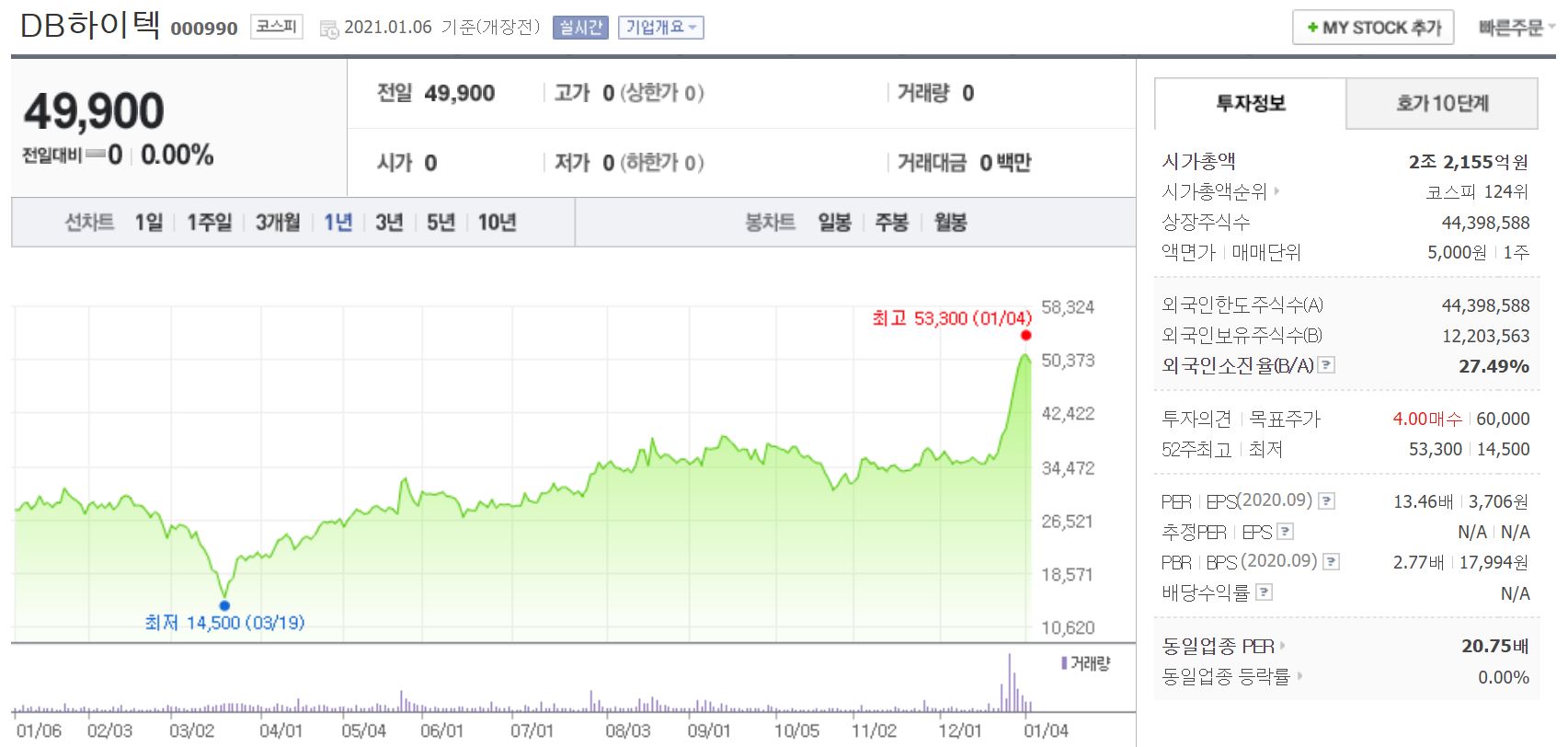 DB하이텍 주가가 가파른 상승세를 보이고 있습니다. 반도체 슈퍼사이클 이슈, 파운드리 공급 부족으로 이슈가 급등세를 보이고 있습니다.