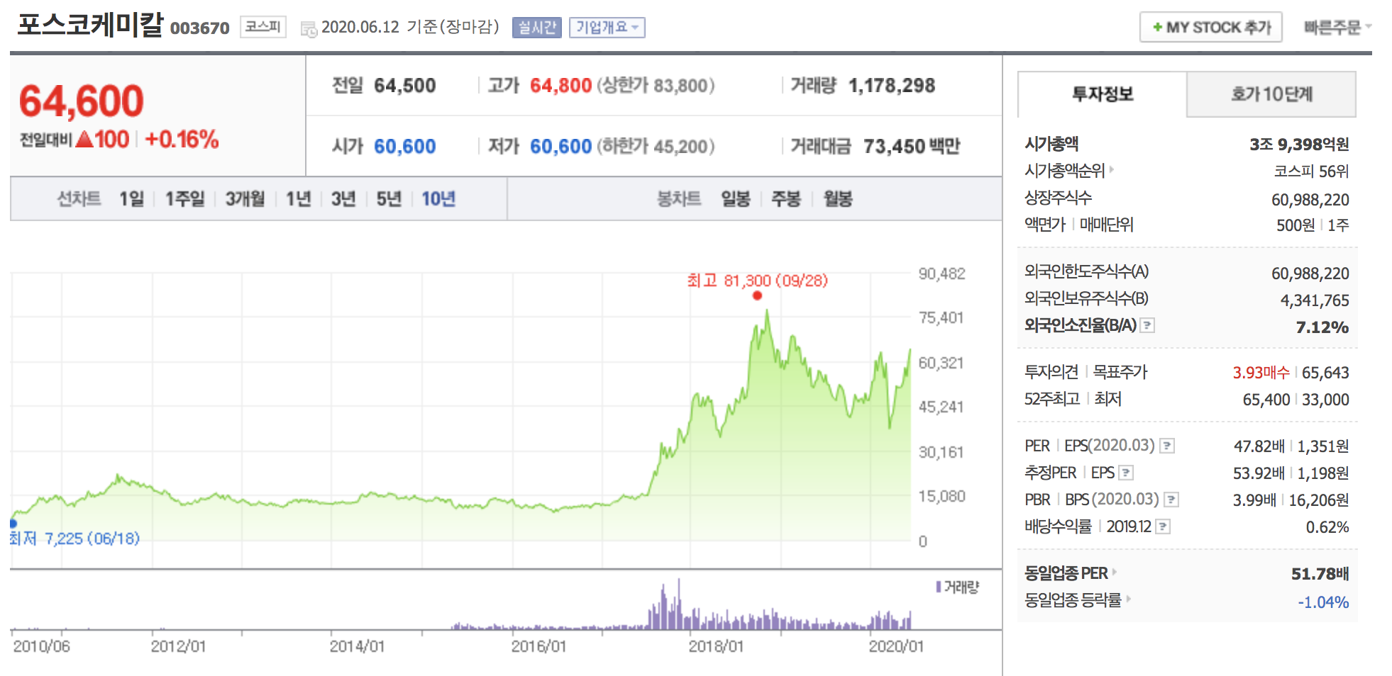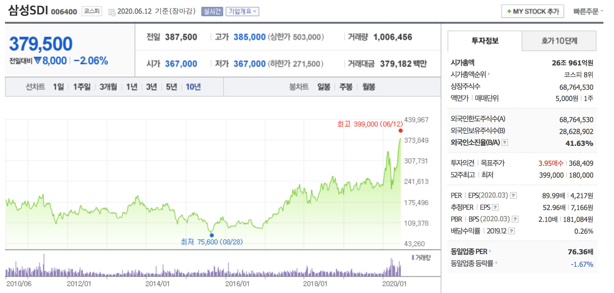 LG화학은 누구나 다 알고있는 2차 전지 대장주이죠. 현재 석유화학 사업과 전지 사업, 첨단소재 사업, 생명과학 사업을 영위하고있습니다. 별 설명이 필요하겠습니까. 2020년 1분기 LG화학 배터리가 탑재된 테슬라 모델3, 아우디 이트론, 르노조 등의 판매 호조에 힘입어 글로벌 전기차 배터리 시장 점유율 1위(27.1%)를 달성하기도 했습니다. 또한 배터리 4대 핵심 소재중 하나인 양극재의 25~30%를 내재화해 공급 안정성을 확보하고 LG전자로부터 분리막을 공급받아 다변화와 안정화를 동시에 이뤘습니다. 석유화학 부문도 원재료 하락에 따른 원가 절감효과 덕분에 빠른속도로 회복하고 있습니다. LG화학의 2020년 초 전기차 배터리 수주 잔고는 150조원으로 1년 만에 40조원이 늘었다고 합니다. 또한 수주 후 2~3년 뒤 매출로 연결되는 만큼 앞으로 꾸준히 성장할 것으로 보입니다.