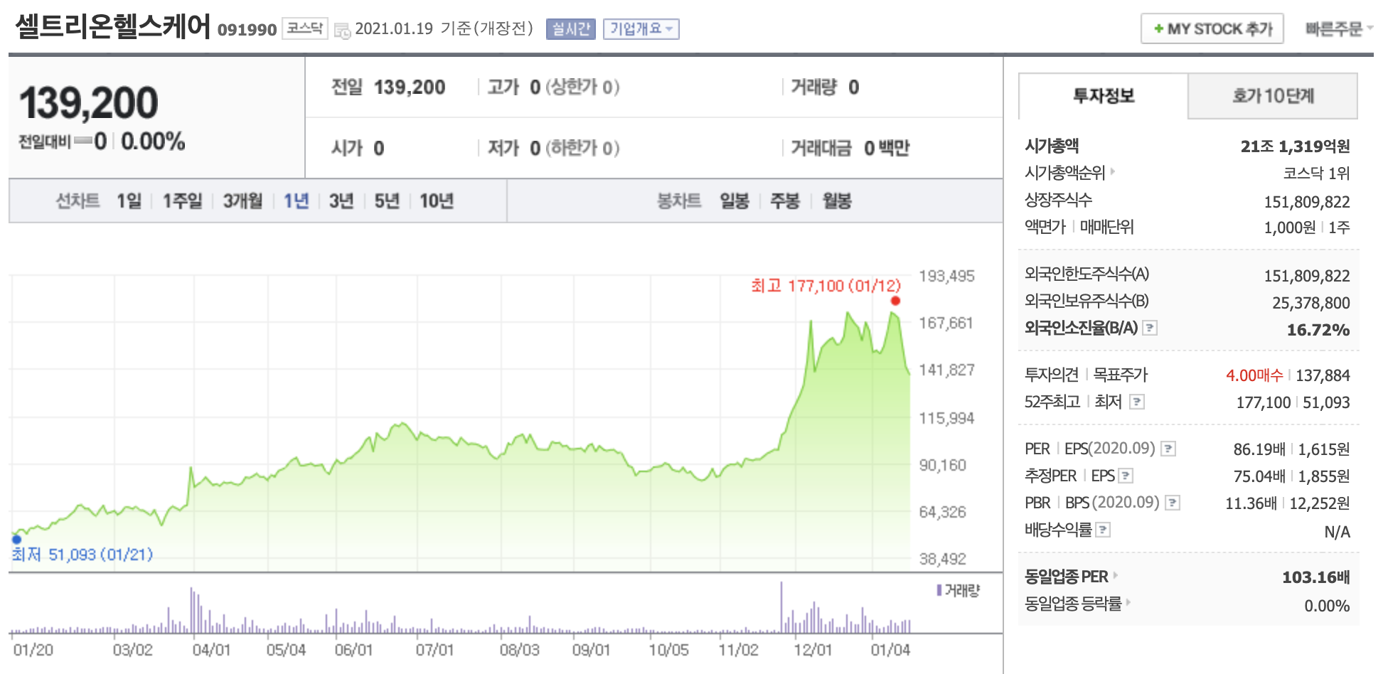 국내 증시가 사상 최고치를 돌파함과 동시에 변동성이 커져가고 있습니다. 1월 18일 셀트리온 헬스케어는 7%가 넘는 상승을 보였다가 -3%로 장마감 하였습니다.