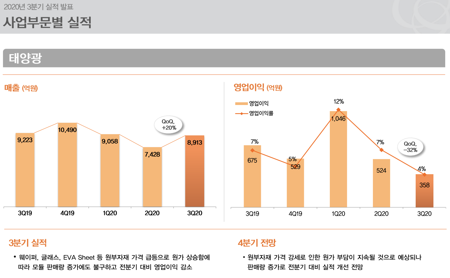 한화솔루션의 경우 2020년 3분기 미국 주거용 태양광 모듈 점유율 27.4%를 기록하며 9분기 연속 1위를 이어갔으며, 상업용 태양광 모듈 점유율은 22.2%로 4분기 연속 1위를 유지했습니다. 또한 독일, 일본에서도 시장 점유율 1위를 기록하고 있습니다.