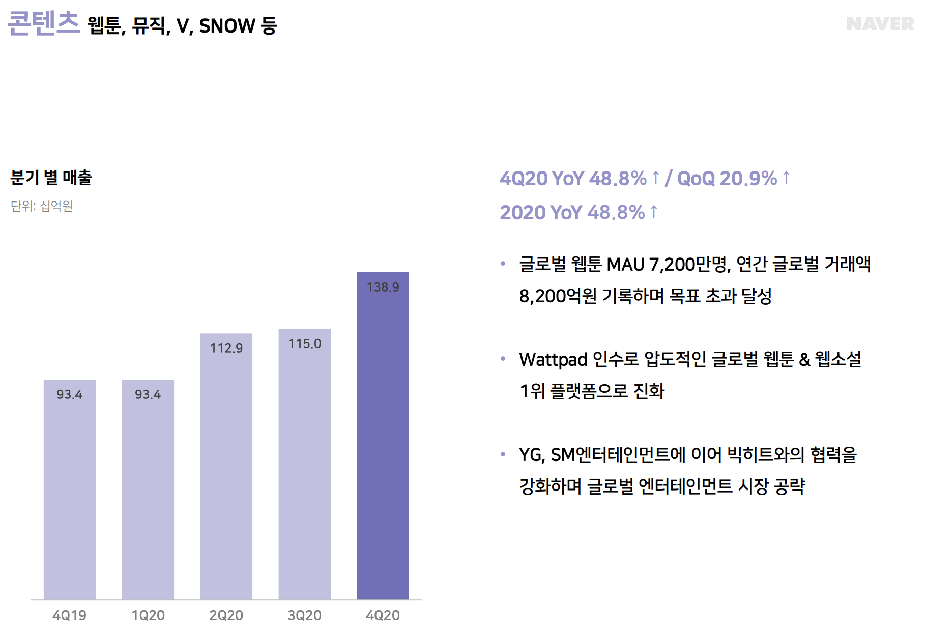 콘텐츠는 글로벌 시장에서 네이버 웹툰이 주목을 받으며 연간기준 전년동기대비 48.8%, 4분기 기준 전분기 대비 20.9% 성장하였습니다.