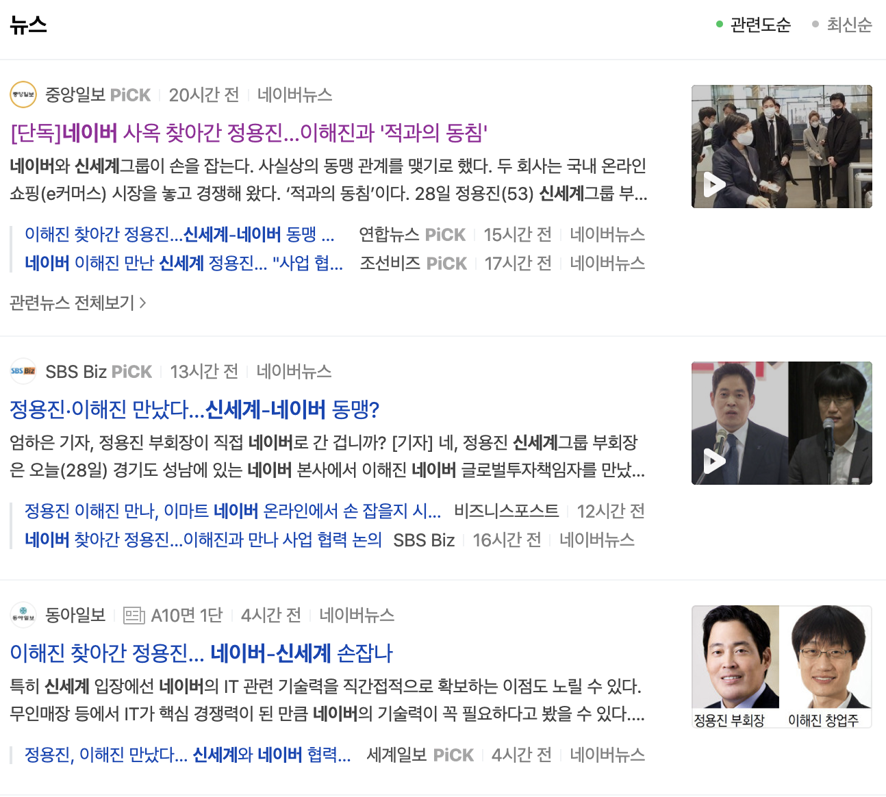 최근 e커머스에서도 신세계와 손잡는다는 보도가 나오면서 기대감이 커지고 있습니다. 신세계그룹 정용진 부회장과 네이버 이해진 GIO가 28일 회동하며 주식교환, 전략적 제휴 등으로 신세계와 함께 온라인 쇼핑 시장 등에서 협력하기로 했다는 소식입니다.