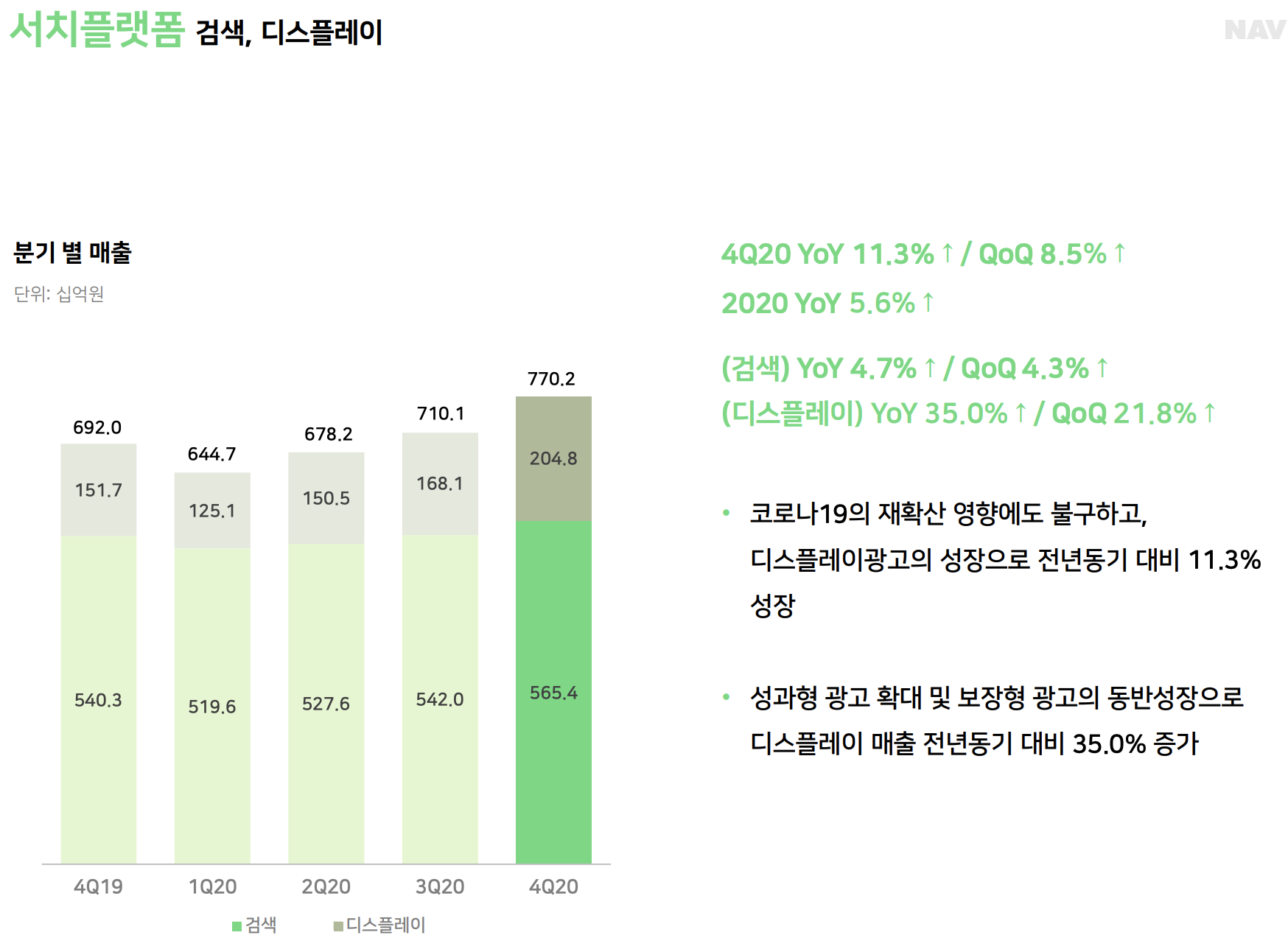 서치플랫폼의 경우 디스플레이의 성장으로 연간기준 전년동기대비 5.6%, 4분기 기준 전분기 대비 8.5% 성장하는 좋은 모습을 보였습니다.
