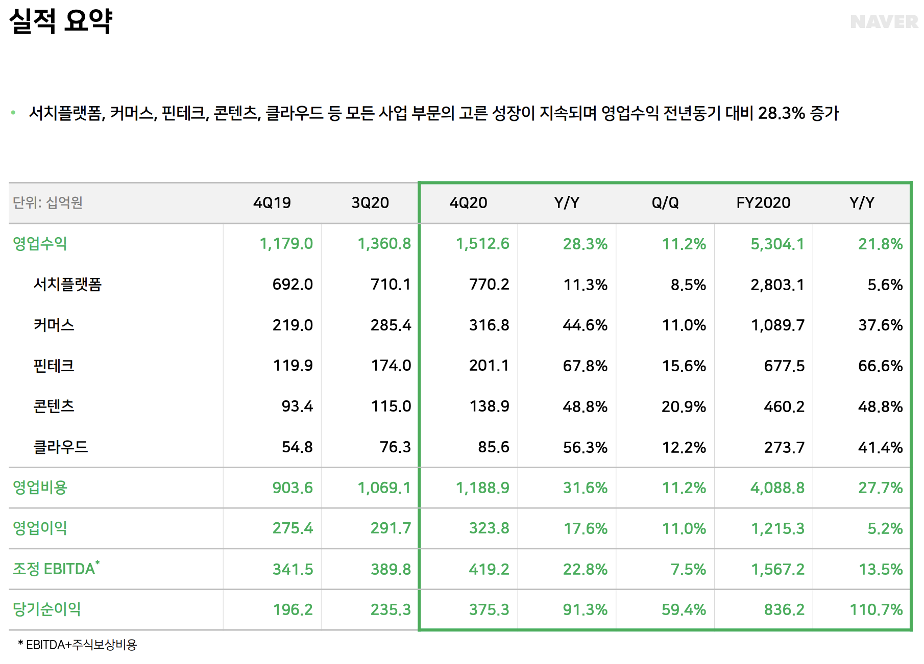 네이버의 4분기 매출은 전년동기대비 11.2% 증가한 1조 5,126억 원을 기록했고, 영업이익의 경우 전년동기대비 11% 증가한 3,238억 원 당기순이익은 3,753억 원을 기록했습니다.