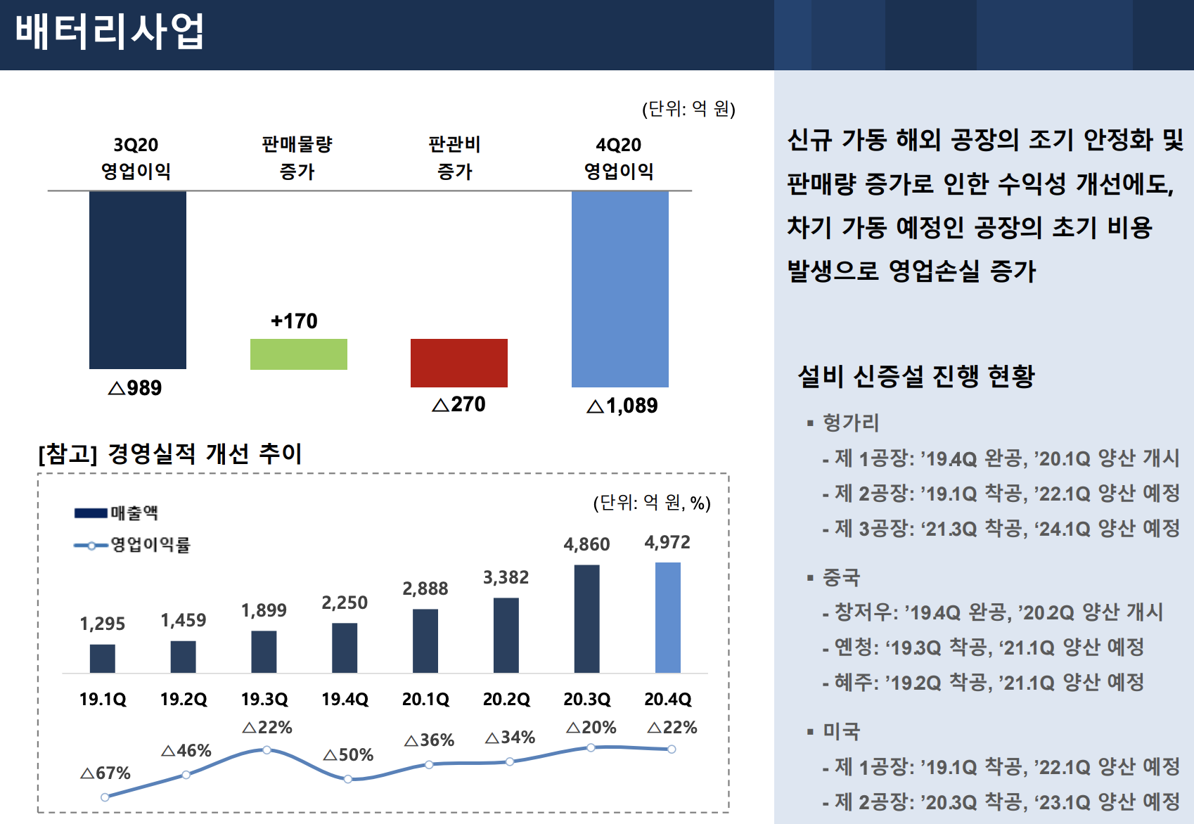 4분기 배터리사업은 매출 4,972억 원을 기록하며 전년 동기 대비 220% 증가(2,250억 원)하는 강한 성장을 보였습니다. 영업이익의 경우 수익성 개선에도 불구하고 해외 공장 투자 초기 비용으로 인해 1,089억 원의 손실을 기록했습니다.