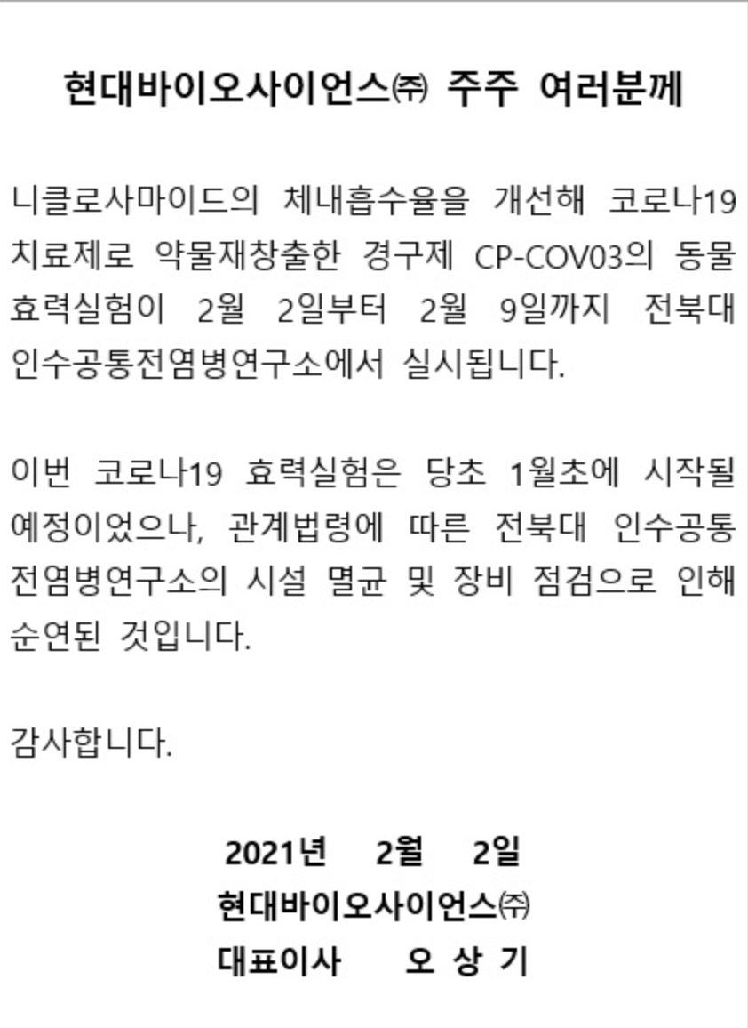 2021년 1월 전북대 인수공통전염병 연구소에서 개발 중인 코로나 19 경구치료제(CP-COV03)의 효능 실험이 끝나는 대로 2상을 진행할 계획입니다. 2월 2일 현대바이오는 1월 예정이었던 효능 실험에 돌입한다고 밝혔습니다.