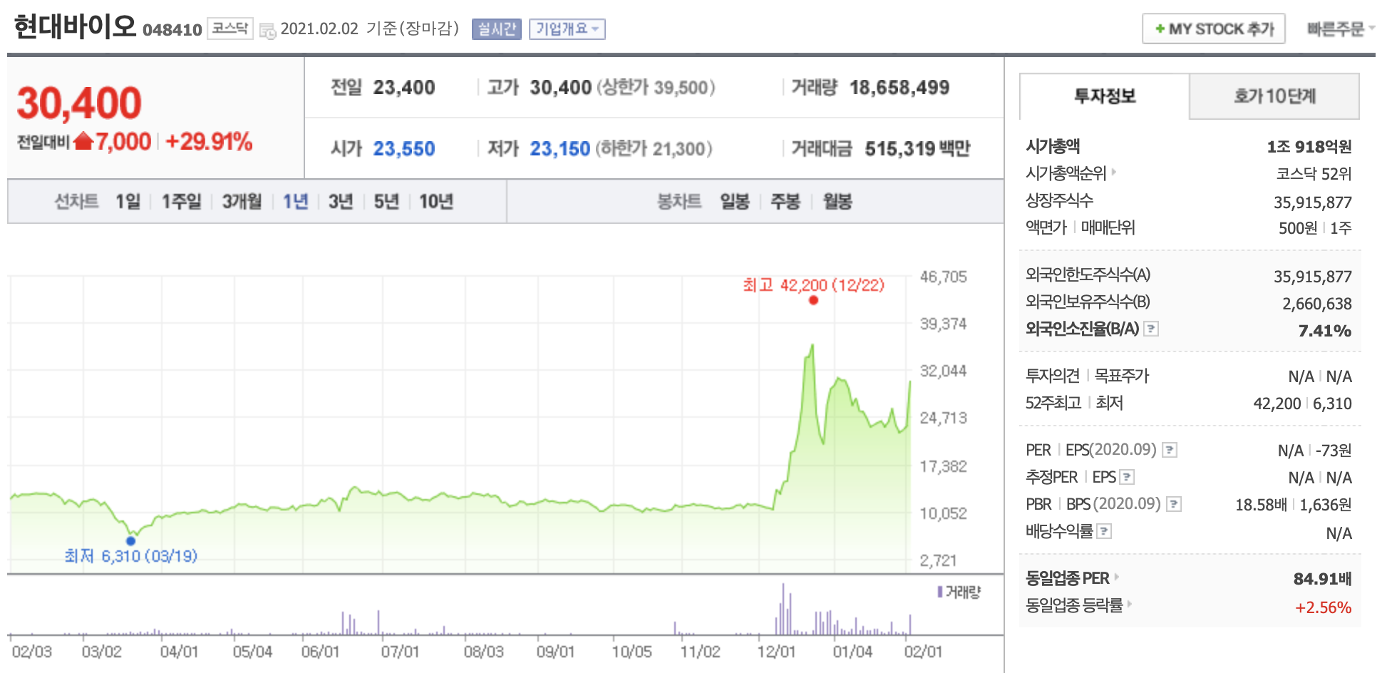 현재 현대바이오 주가는 과하게 올라와있는 상황입니다. 코로나 19 치료제, 기존에 진행 중이던 사업이 모두 좋은 소식을 알린다 하더라도 지금 주가는 과한 상황입니다.