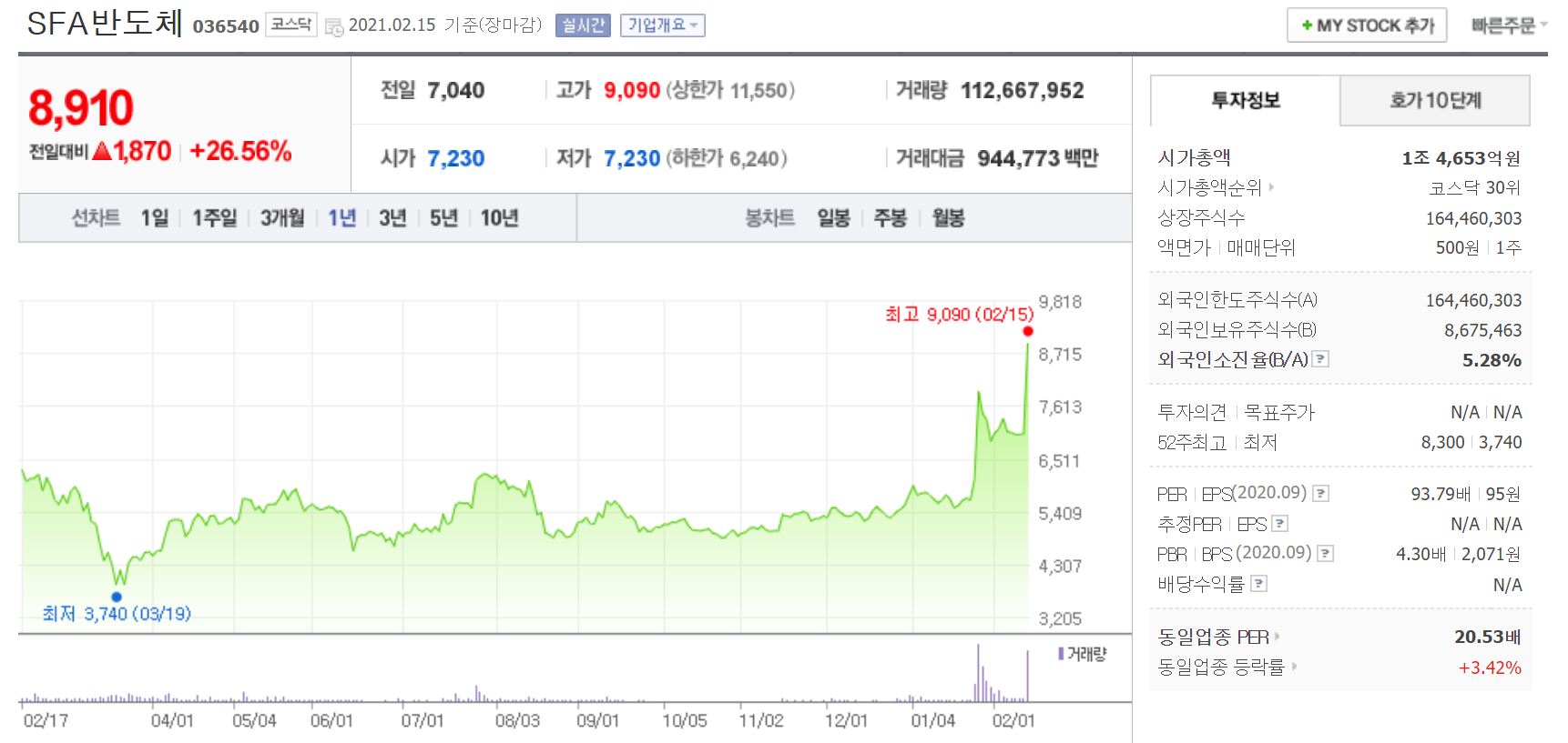SFA반도체 주가를 살펴보면, 주요 고객사인 삼성전자가 테슬라와 손잡고 완전 자율주행차 핵심 반도체를 개발한다는 소식에 주가는 상승 흐름을 타더니 상한가에 도달했고 이후 조정을 받다 다시 급등세를 보이고 있습니다.