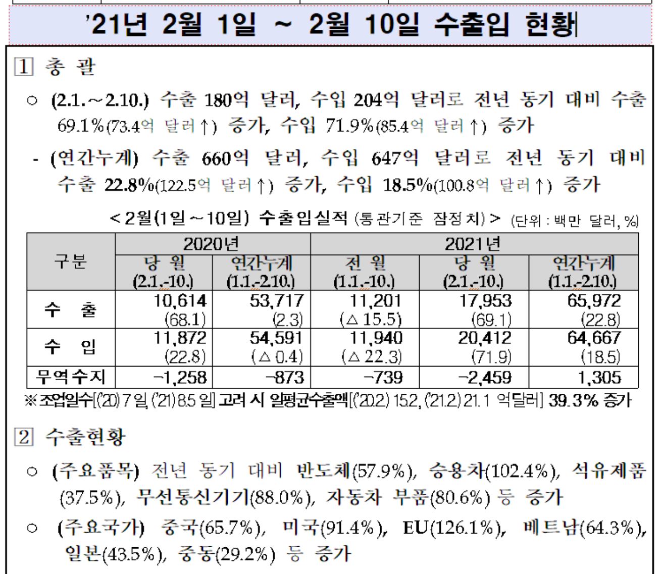 2월 수출 데이터가 발표되었는데 자동차, 반도체, 무선통신기기 주도로 2월 1~10일 수출액이 지난해 같은기간보다 69.1%(73억 3,900만 달러) 증가하는 엄청난 모습을 보였습니다.