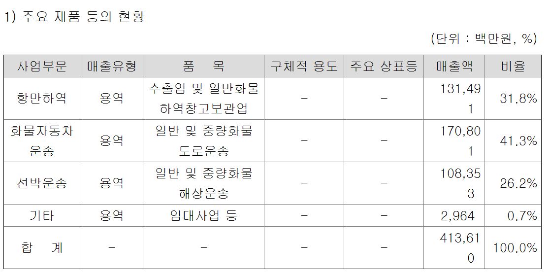 동방은 항만하역(수상화물취급업), 육상운송(일반자동차운송), 해상운송(내/외항운송화물업) 등을 영위하고 있습니다. 매출비중은 각각 20~40% 사이를 유지하고 있습니다.