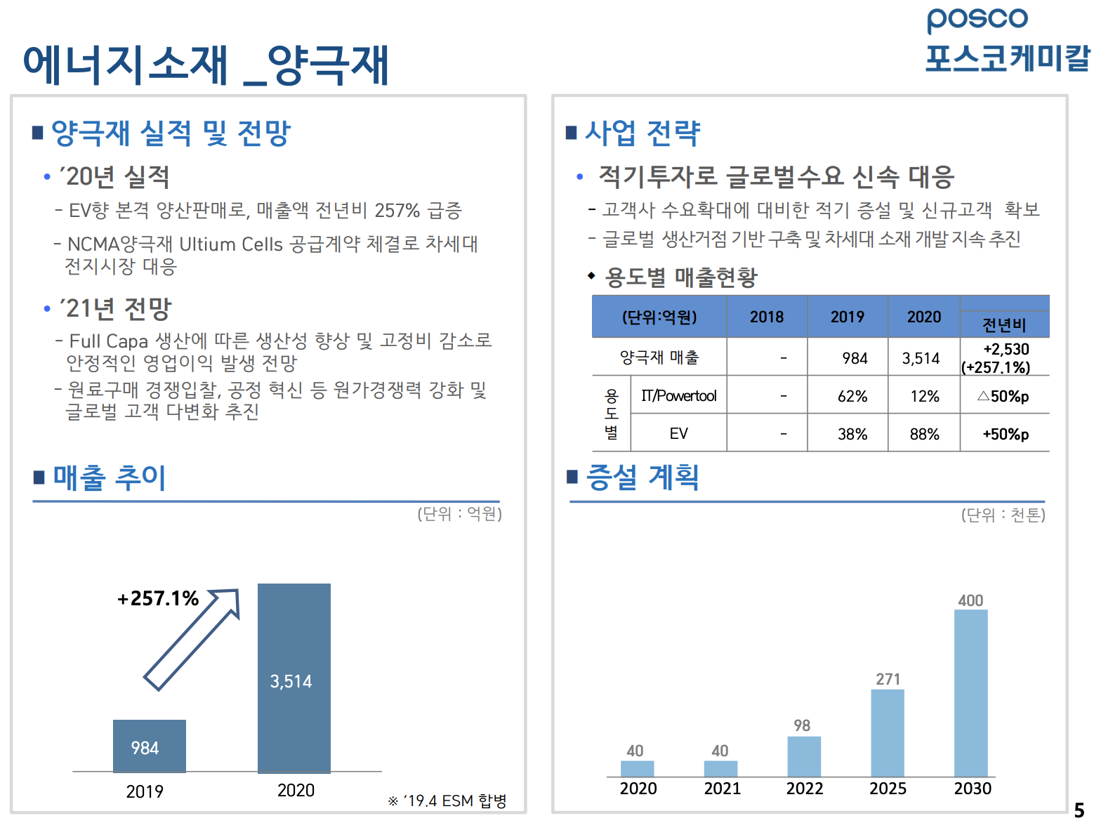 2020년 5월 포스코케미칼은 광양 율촌산단에 하이니켈 기반의 양극재 생산을 위한 설비투자가 마무리되면서 연간 4만톤 규모로 생산능력을 늘렸으며, 최근 양극재 생산 확대를 위해 광양에 3만톤 규모의 확장 건설 공사에 돌입했습니다.