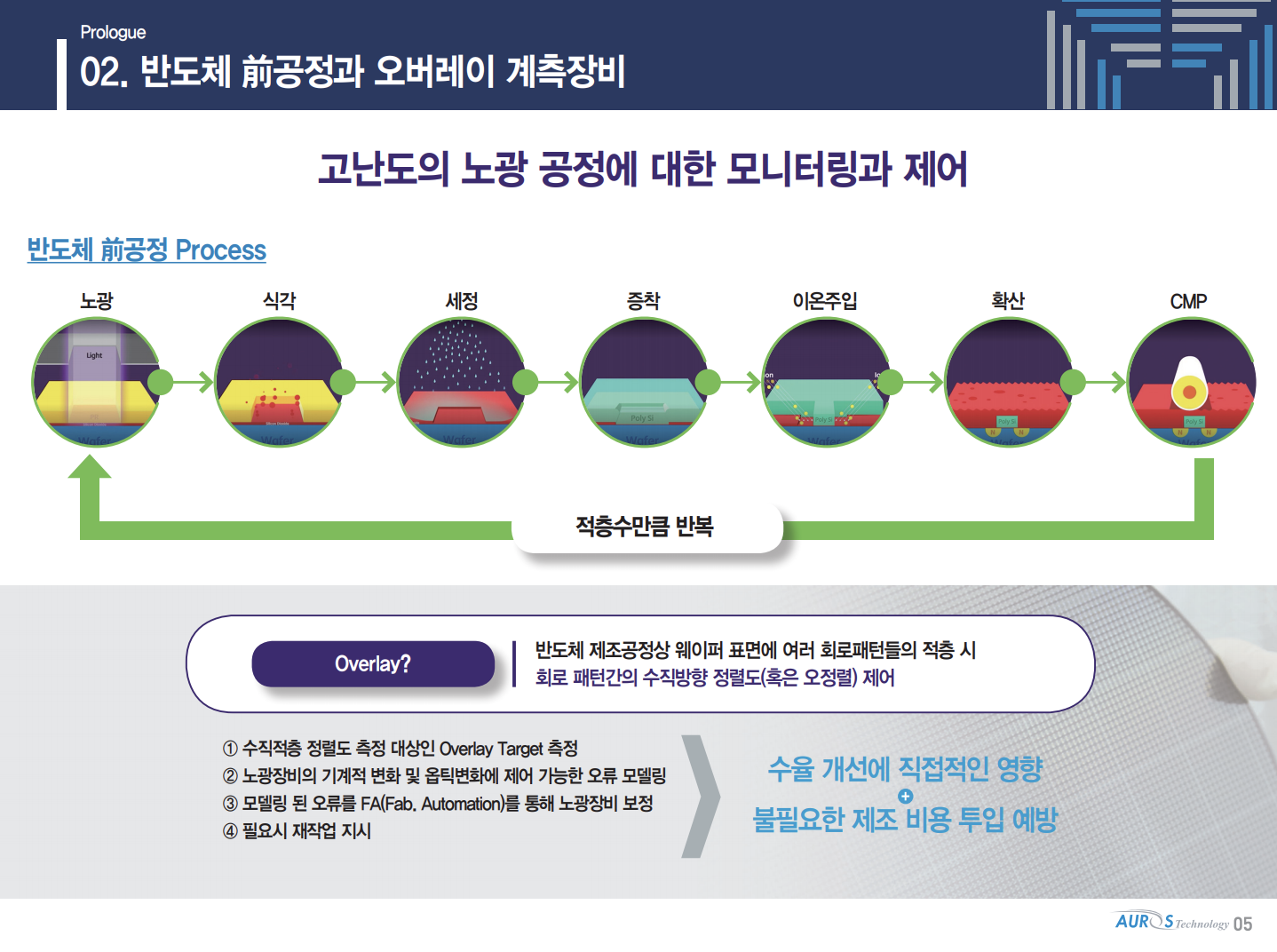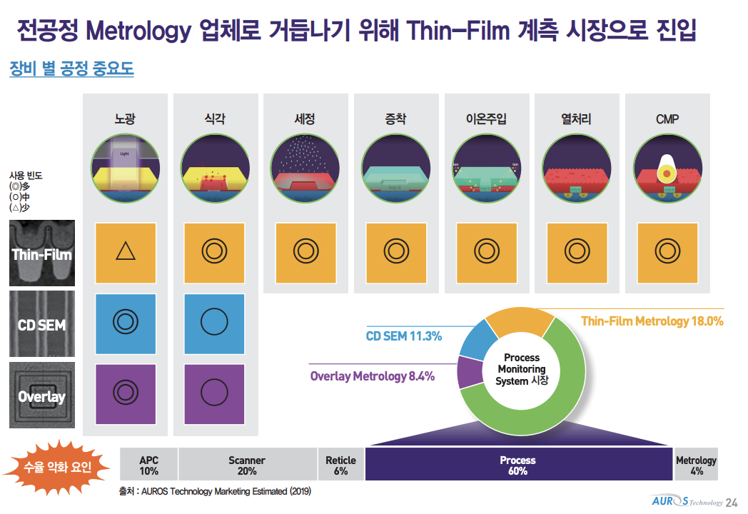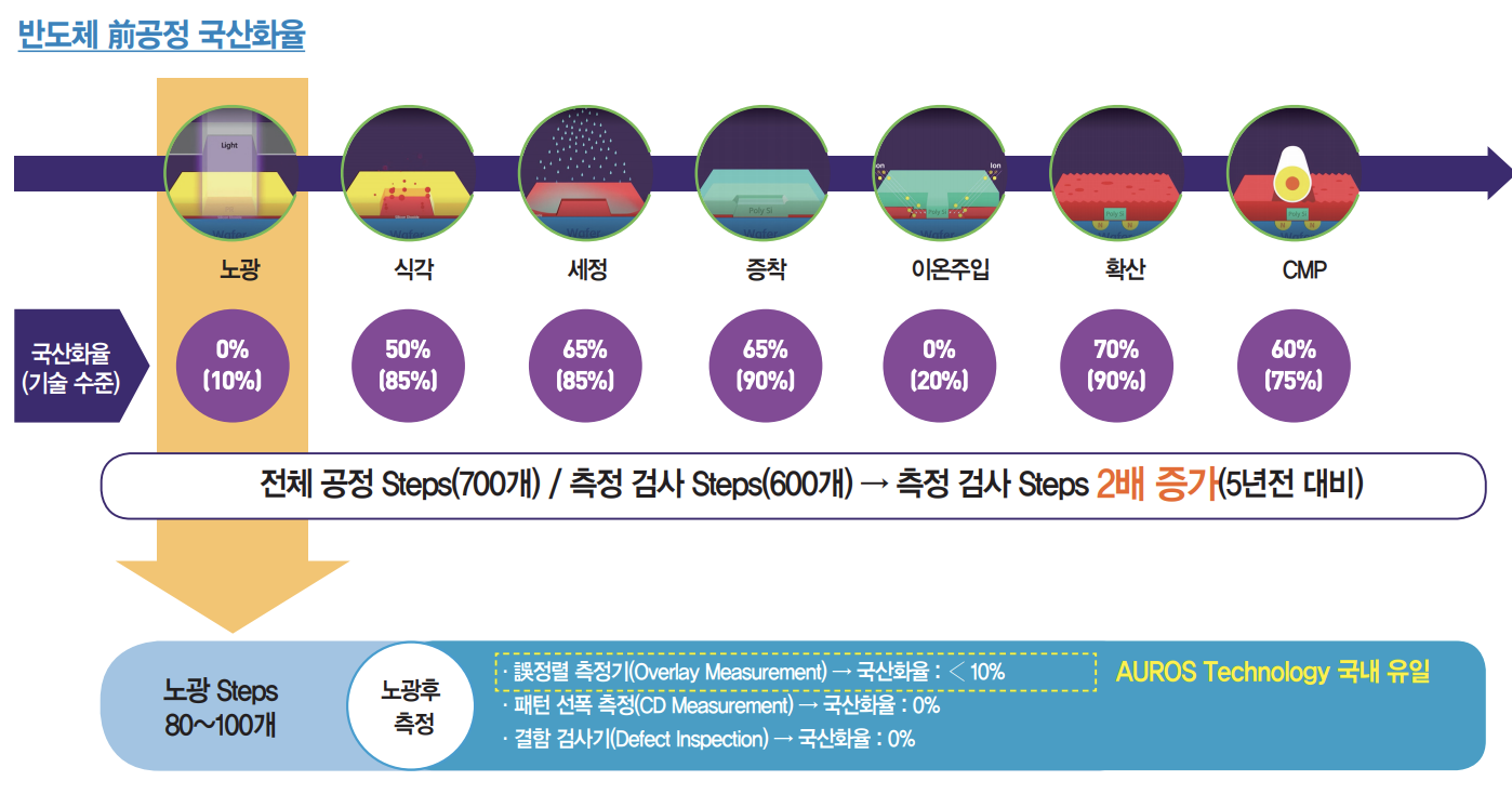 반도체 전공정 제조 과정은 웨이퍼에 노광, 식각, 세정, 증착, 이온주입, 확산, CMP 등의 절차를 거치는데 오로스테크놀로지가 국산화에 성공한 오정렬 측정장비는 핵심공정인 노광 공정 등에서 회로 패턴에 맞춰 실제로 적층이 잘되었는데 검사하는 장비입니다.