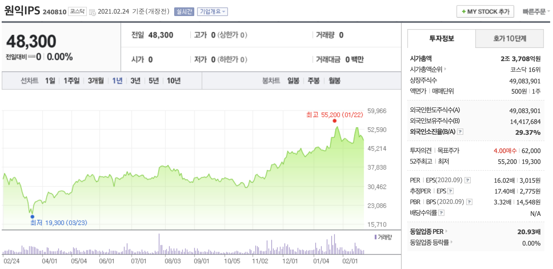 2020년 신규상장한 반도체 장비 기업인 넥스틴의 경우 공모가 대기 약 3배 정도의 주가 상승을 보였으며, 국내 대표적인 반도체 장비 기업인 원익IPS 역시 코로나 저점대비 2~3배 가까운 주가 상승을 보였습니다.