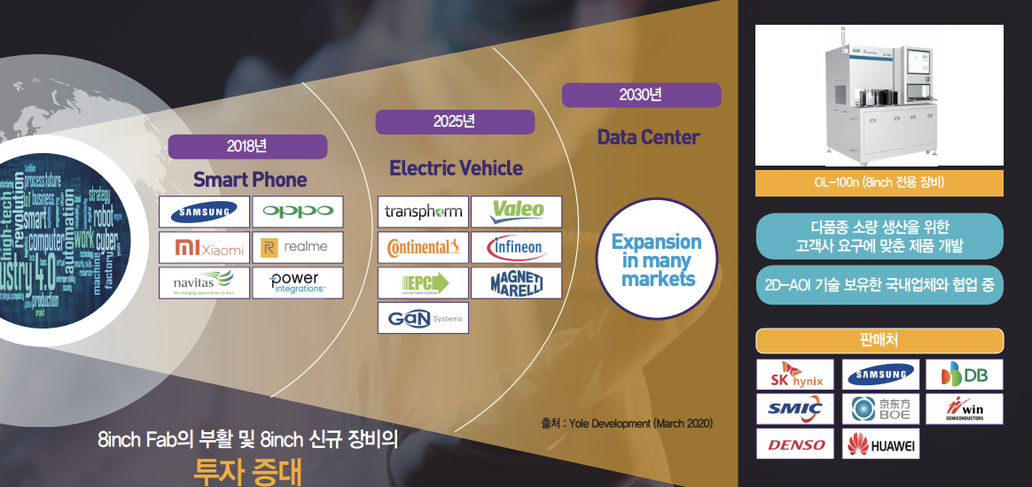오버레이 계측장비 시장의 경우 2020년~2023년까지 연평균 18.9%의 성장률을 보일 것으로 전망되고 있으며 오로스테크놀로지의 주요 제품군인 12인치의 경우 약 40개의 Fab이 2024년까지 증성될 예정이며 8인치의 경우 약 10개의 Fab이 증설될 예정입니다.