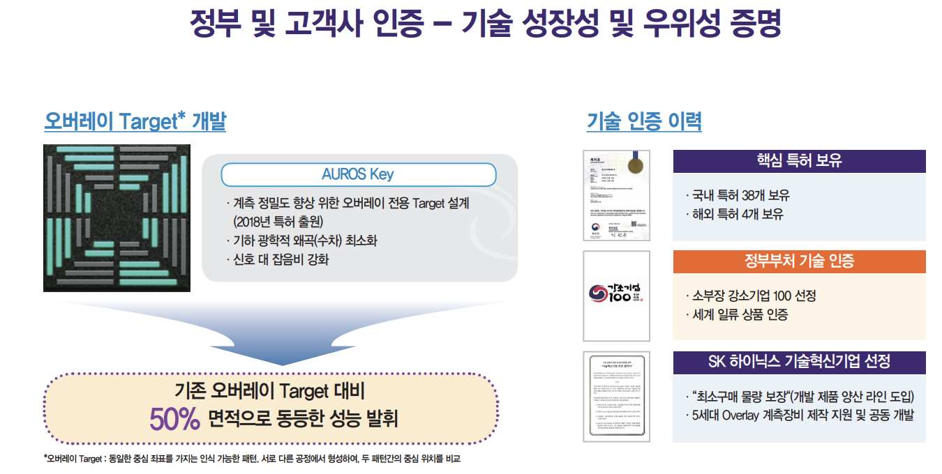 오로스테크놀로지는 원천 기술을 확보해 경쟁력을 갖추고, 기술성 평가에서 A등급으로 평가받으며 소부장 강소기업 100, 세계일류상품에 선정되기도 했습니다. 또한 SK하이닉스 기술혁신기업에 선정되며 최소구매 물량 보장하기도 했습니다.