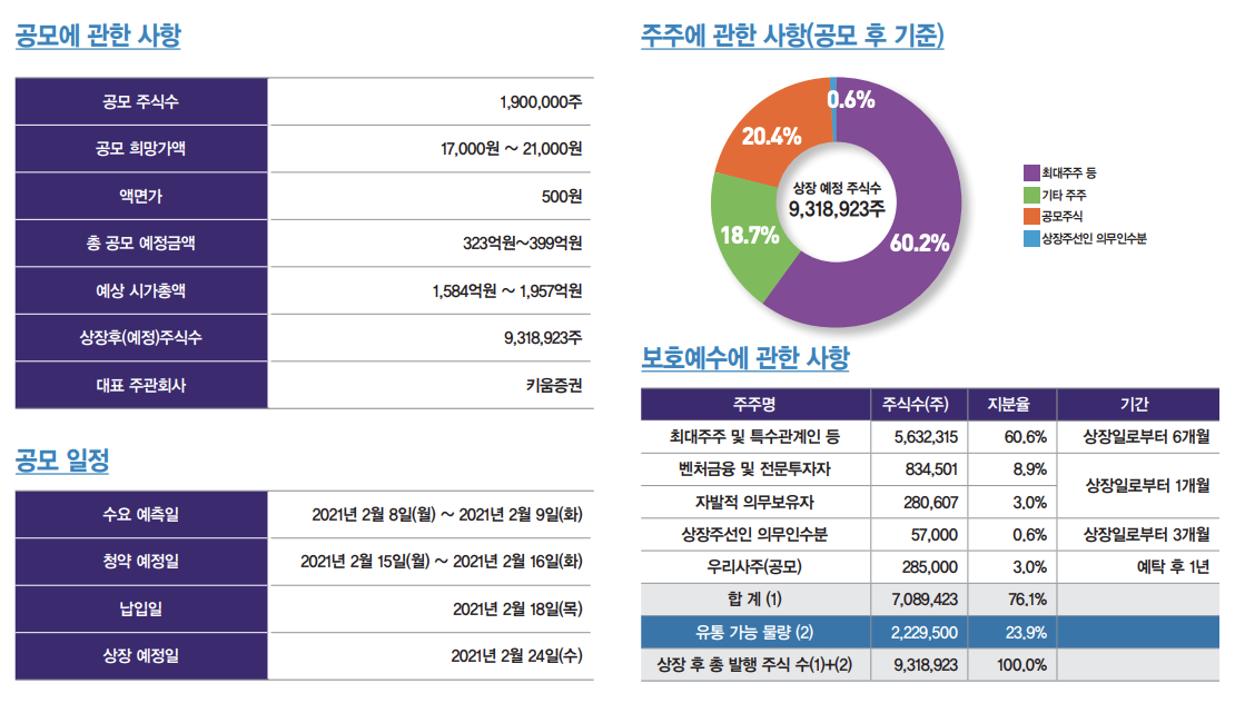 공모가 21,000원 기준 상장 후 예상 시가총액은 1,957억 원입니다. 전체 락업 물량은 76.1%이며 유통 가능 물량은 23.9%으로 적은 수준이기에 가파른 주가 상승을 이어갈 수도 있을 것으로 보입니다.