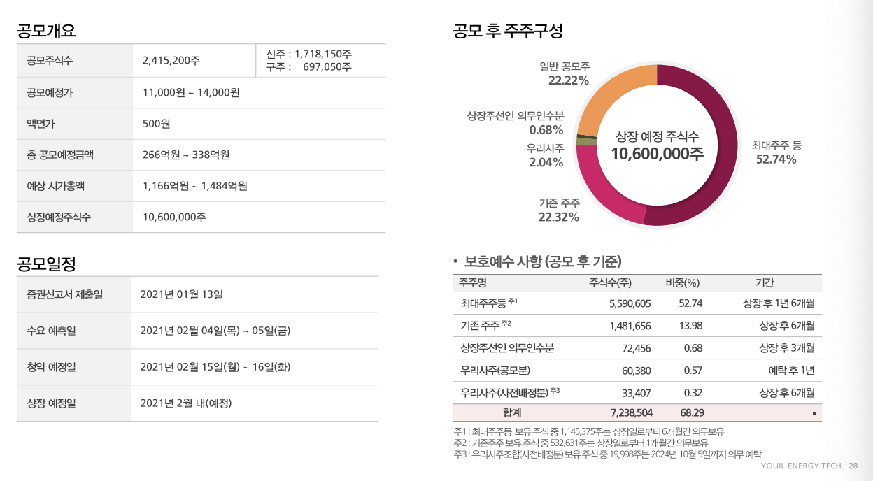 유일에너테크의 경우 규모가 상당히 작은 신영증권을 상장주관사로 두고 공모를 진행했으며, 신영증권의 경우 비대면 계좌 개설도 되지 않고, 증권사 영업점도 전국에 몇개 없는 상황이었기에 주목도에 비해 적은 수의 공모주 투자가 이뤄졌을 것으로 예상됩니다.