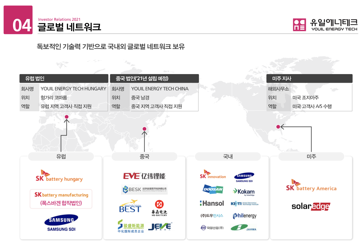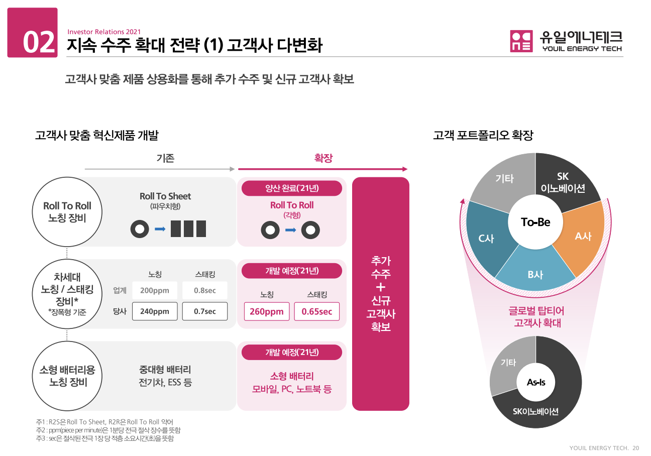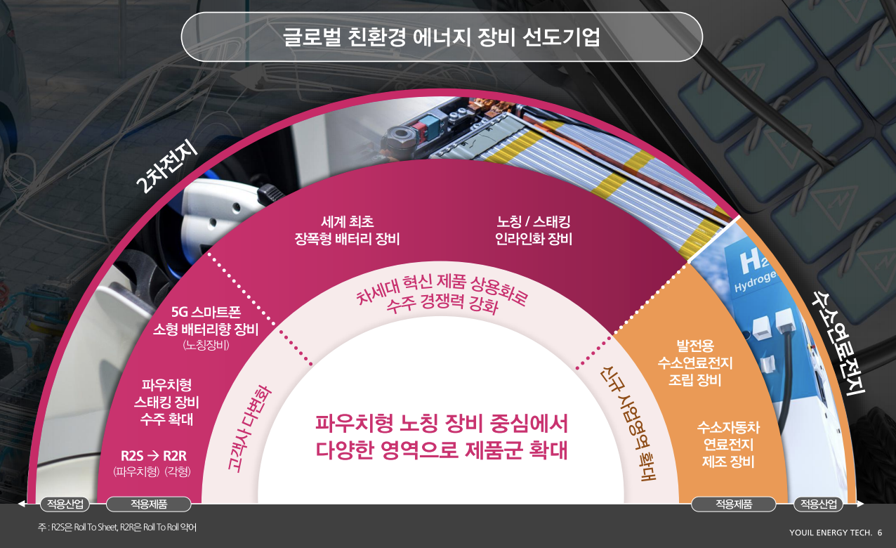 유일에너테크는 기존 파우치형 배터리 노칭장비 중심의 사업에서 각형 배터리 롤투롤 노칭 장비, 파우치형 배터리 스태킹 장비, 5G 스마트폰용 소형 배터리 장비, 수소연료전지 제조장비 등 각광받고있는 전기차, 5G, 수소 산업에 뛰어들었습니다.