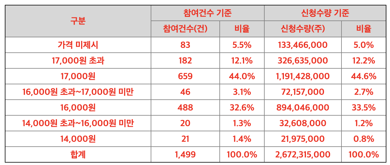 2월 5~6일 기관 투자가 대상의 수요예측에서 1,499개의 기관이 참여해 경쟁률 1,427.69대1을 기록하였으며 공모가가 희망 밴드(11,000원~14,000원)를 초과한 16,000원에 확정했습니다.