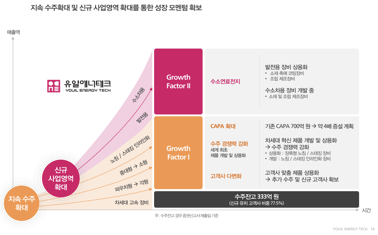 유일에너테크의 매력은 앞서 말씀드린 것처럼 2차전지 장비업체로 그치지 않는다는 점입니다. 친환경 투자에서 가장 각광받고 있는 투자처 중 하나인 수소 관련 사업에도 적극적인 모습입니다.