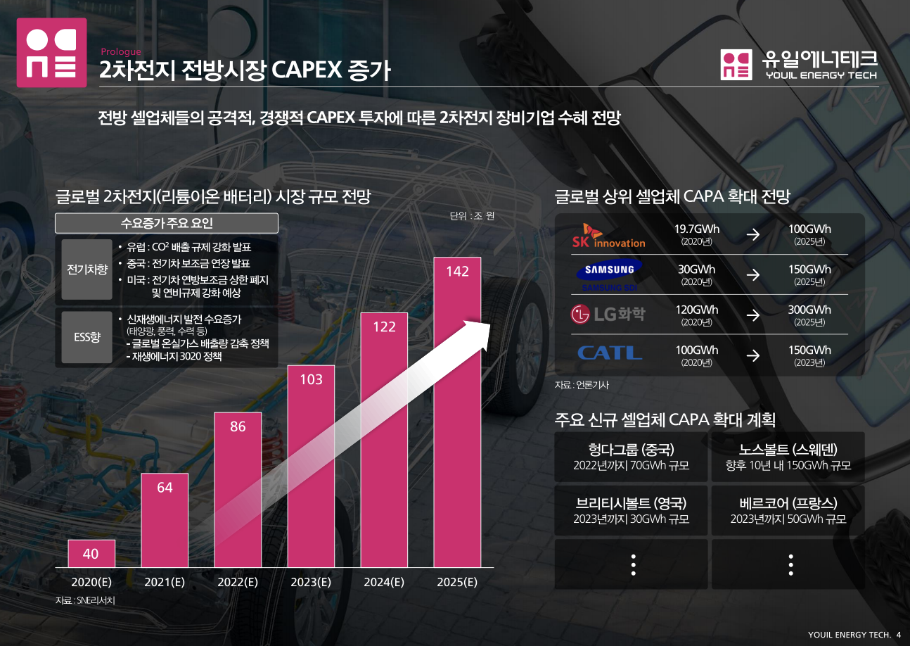 2차전지 시장은 2020년 40조 원에서 2023년 103조 원, 2025년 142조 원규모까지 성장할 것으로 전망되고 있고 이에따라 공격적인 증설투자가 이어지고 있어 2차전지 장비 기업인 유일에너테크는 물만난 고기가 되었습니다.