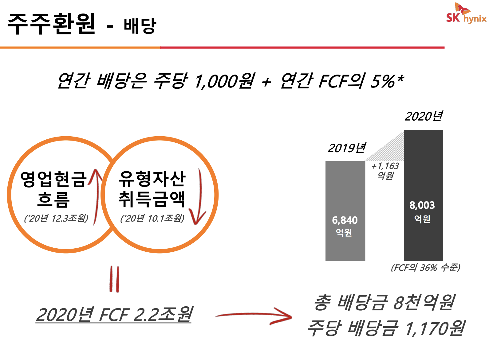 2020년 SK하이닉스 배당금은 주당 1,170원으로 배당수익률은 0.8% 정도를 기록하고 있습니다. 향후 배당의 경우 주당 1,000원 + 연간 FCF(영업현금흐름)의 5%를 배당할 예정입니다.