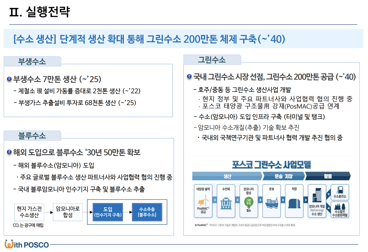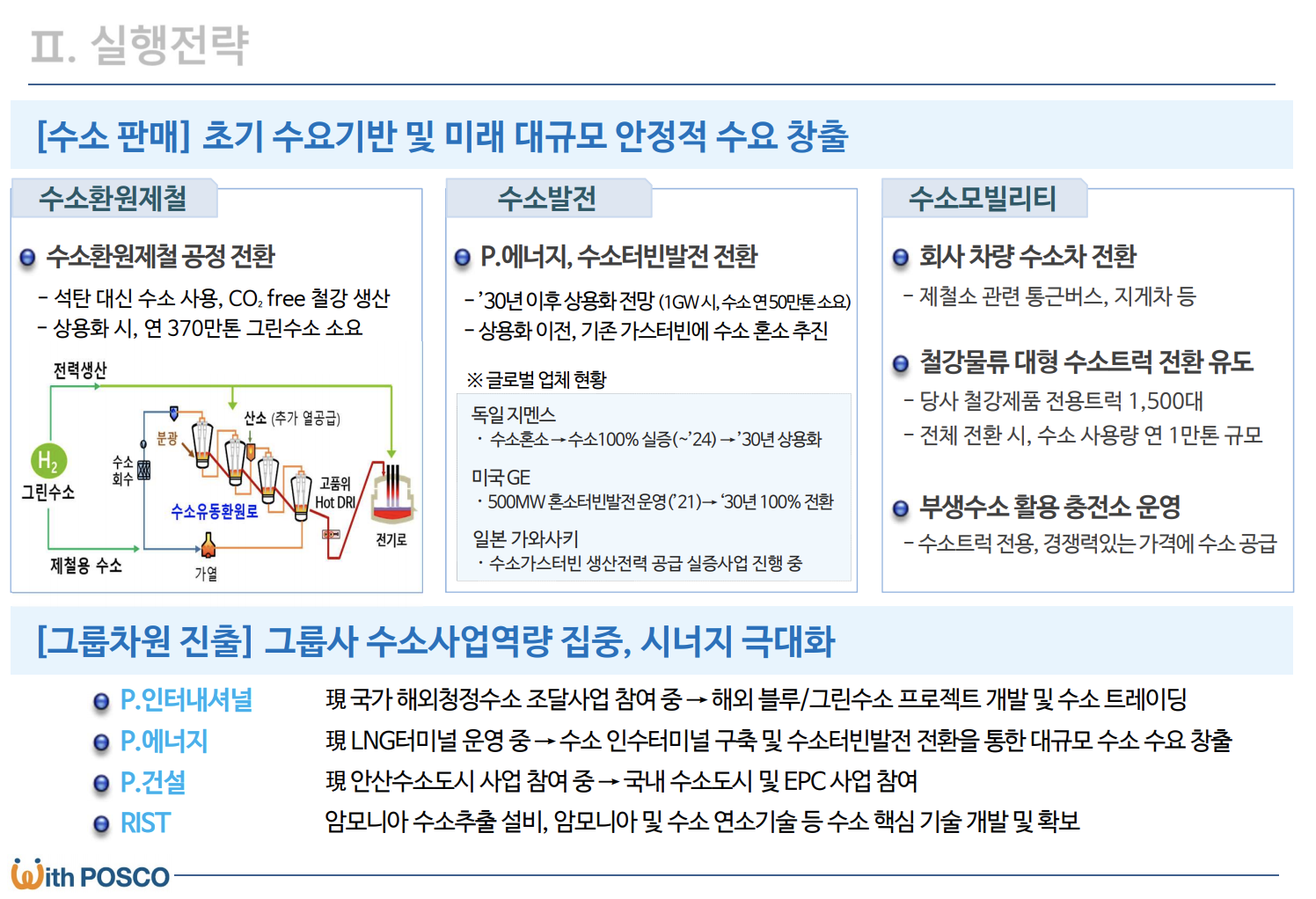 또한 수소환원제철개발 등에 10조 원을 투입할 예정입니다. 현대차그룹과 협력하여 수소에너지 활용 기술 개발, 포스코 제철수 운영차량을 무공해 수소전기차로 전환, 수소 사업 공동 협력 등에 대해 합의를 했습니다.
