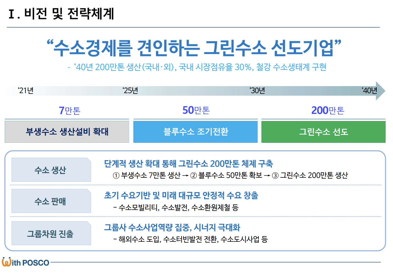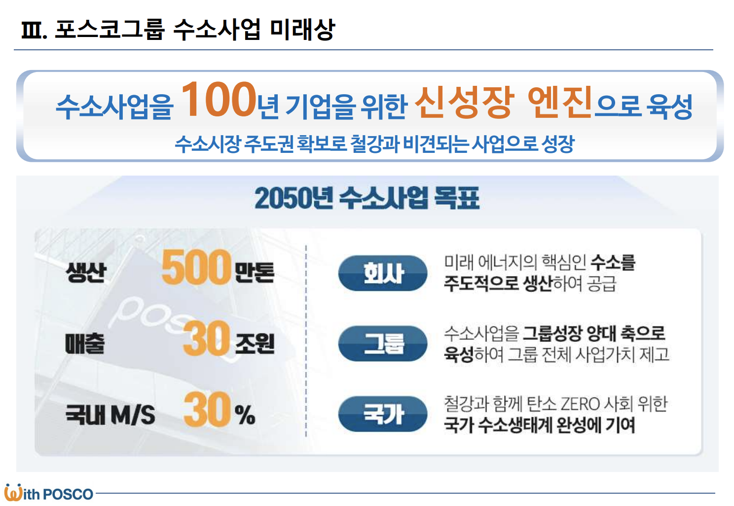포스코는 여기서 그치지 않고 수소 사업에도 뛰어들고 있습니다. 많은 탄소를 배출하고 있는만큼 수소 사업에 적극 뛰어들 것으로 예상되고 있는데, 포스코는 2025년까지 7만톤, 2030년 50만톤, 2050년 500만톤의 수소생산체제를 구축할 예정입니다.