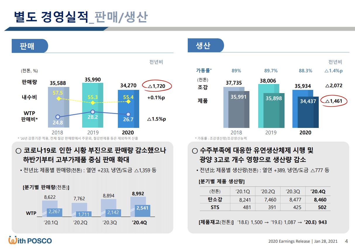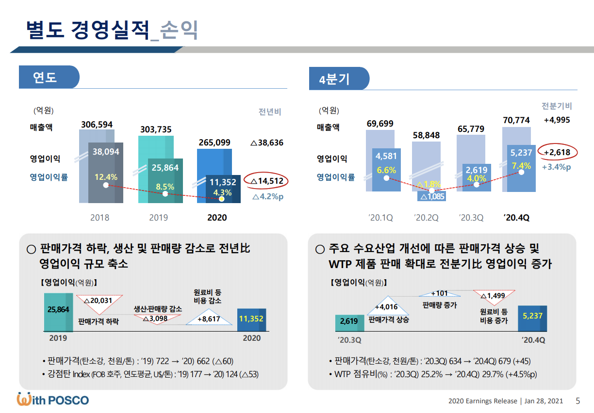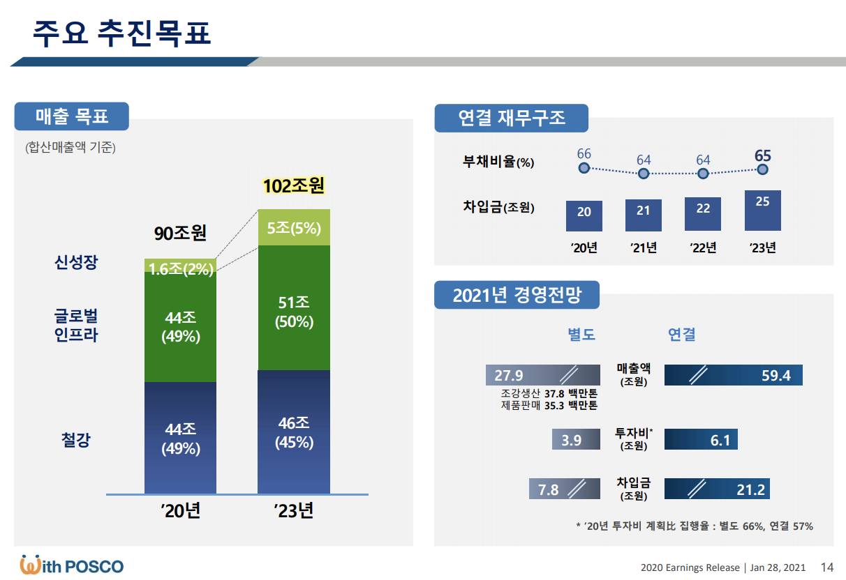 주력제품인 탄소강(철, 탄소의 합금)의 올해 1분기 평균판매가는 전분기 대비 5만 원 증가한 73만 3,000원 기록할 것으로 전망되고 있으며 3월부터는 실수요향 열연강판 가격도 톤당 5만 원 인상할 예정입니다.