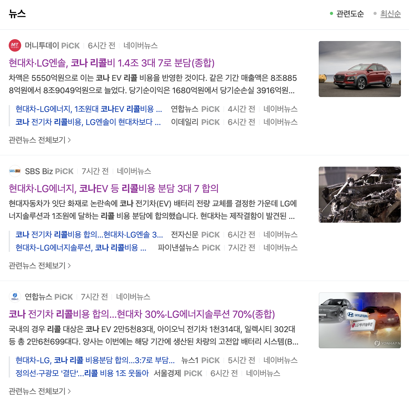 현대차의 전기차 코나 리콜비용 합의가 마무리 되었습니다. 4일 현대자동차와 LG에너지솔루션(LG화학)이 코나, 아이오닉, 일렉시티 버스 등 현대차의 전기차 약 82,000대에 대한 리콜 비용 분담에 대해 합의를 했습니다.