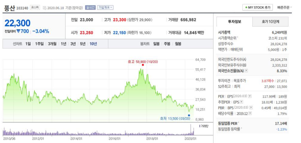 풍산은 비철금속 생산 전문업체로 압연, 동관, 봉, 소전, 스테인리스를 생산하며 각종 탄약류를 생산하는 특수사업(방산사업)도 영위하고 있습니다. 풍산은 북한 이슈뿐만 아니라 구릿값에서 영향을 받는 종목입니다. 최근 구리값 상승에 힘입어 가파른 상승을 보여주기도 했습니다. 국민연금이 13.65%를 보유하고 있습니다.
