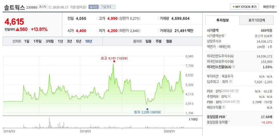 솔트웍스는 무기체계의 가상훈련시스템 개발, 종합군수지원 사업, 국방 시뮬레이터 개발 등의 교육훈련용 솔루션 개발 및 서비스를 주요 사업으로 영위하고 있습니다. VR, AR, MR을 기반으로 한 제품을 만들어 미래가치가 더욱 중요해질 기업으로 보이며 다양한 가상체험 관련 훈련 국책과제를 수행하고 있습니다. 하지만 장기간 거래정지가 된 적이 있어 투자시 유의할 필요가 있어 보입니다. 17일 13.81%의 상승을 보여주었습니다.