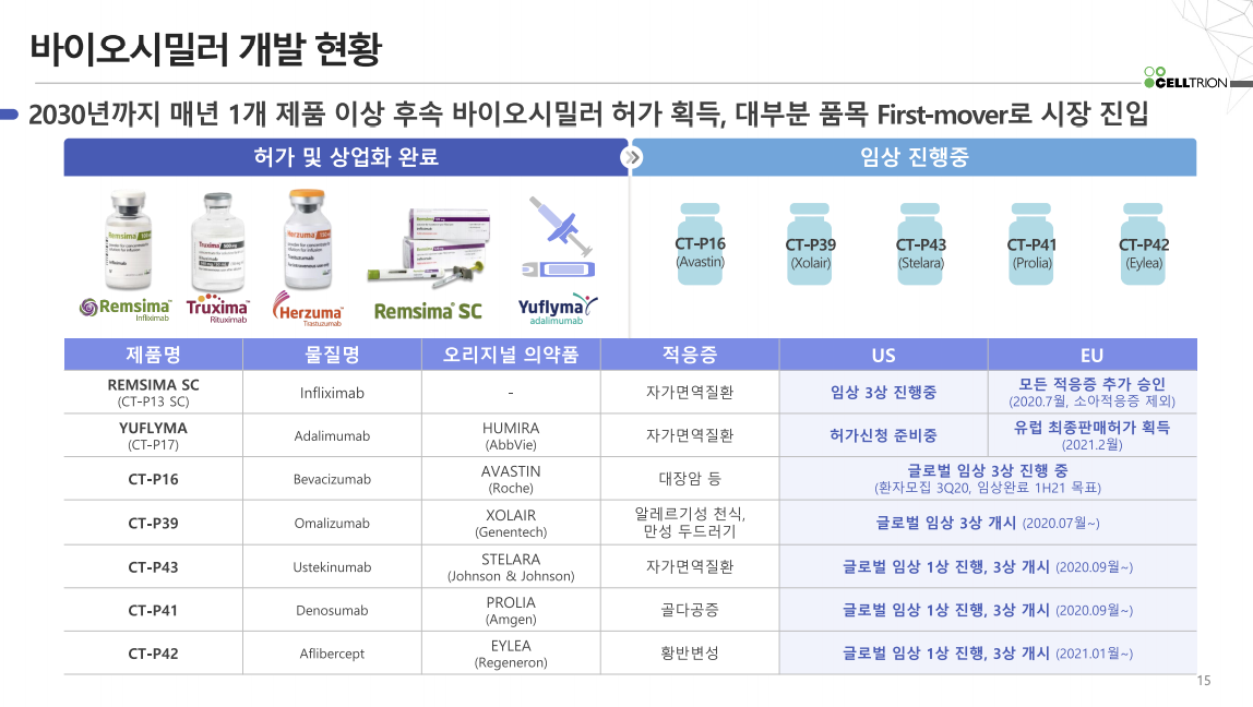 렉키로나 이외에도 신규 바이오시밀러 제품을 꾸준히 출시하고 있으며, 글로벌 임상 3상을 진행하는 바이오시밀러가 다수 존재하고 있어 다양한 모멘텀이 남아있는 셀트리온입니다.