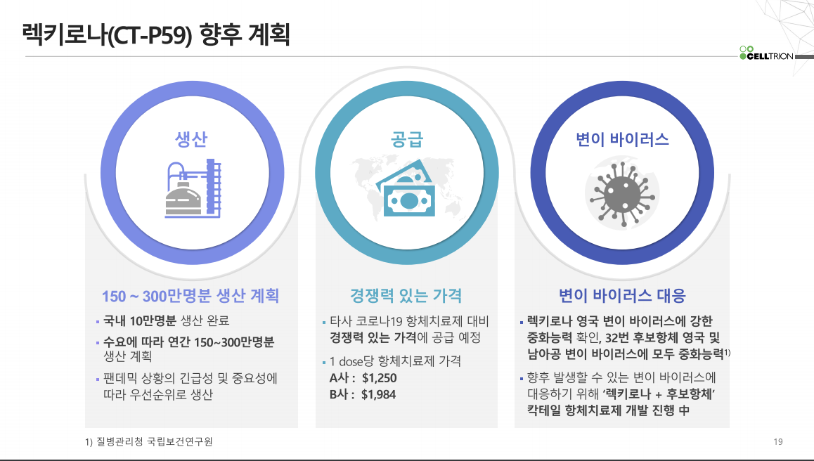 셀트리온의 렉키로나 이외의 코로나 19 항체치료제 상용화에 성공한 회사는 릴라이릴리와 리제네론인데 모두 미국회사이며, 미국 현지 공급에 중점을 두고 있습니다.