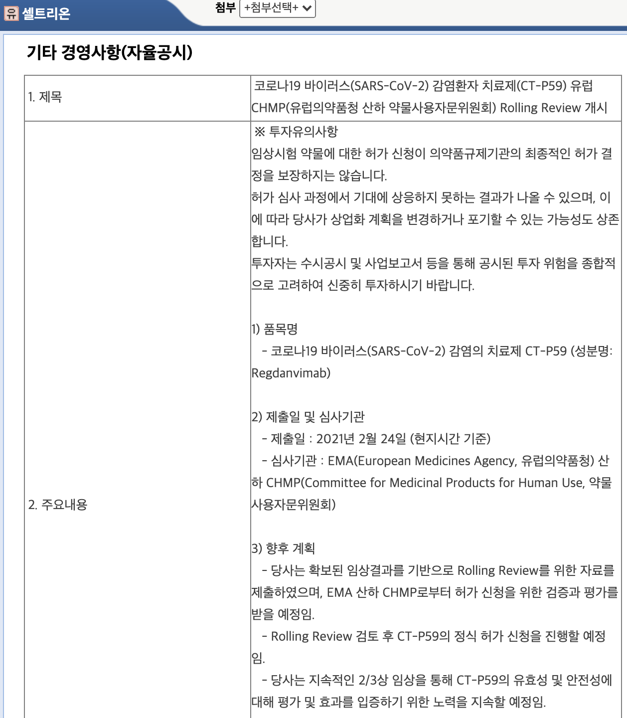 일라이릴리의 항체 칵테일 치료제는 21년 2월 4일 롤링리뷰를 시작했으며, 셀트리온은 21년 2월 24일 롤링리뷰를 개시했습니다.