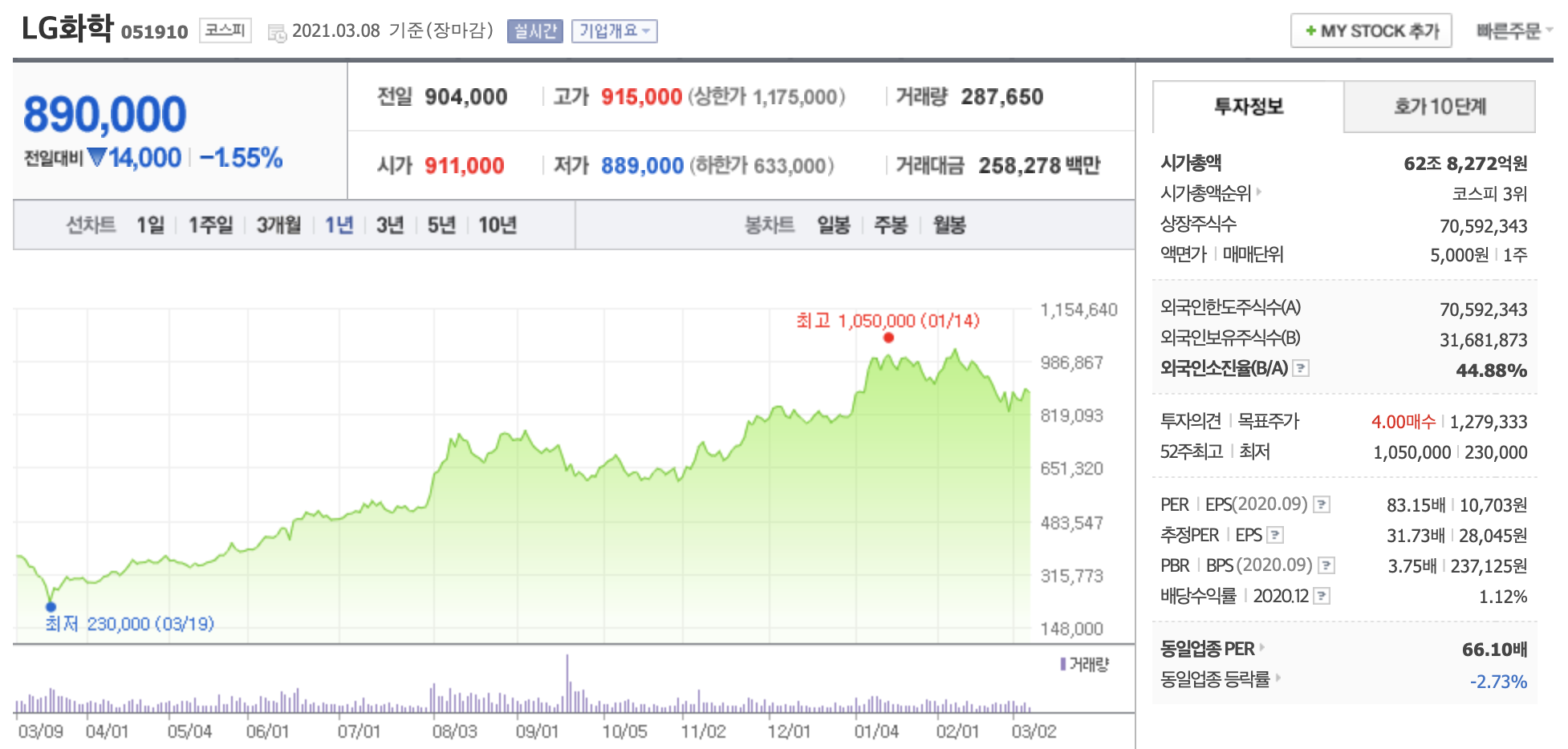 LG화학 주가의 경우 국내 배터리 3사 중에서는 가장 적은 낙폭을 보이며 선방하는 모습을 보이고 있습니다. 3월 8일 종가 기준 최고점이 105만 원보다 15.24% 떨어진 89만 원을 기록하고 있습니다. 고점대비 삼성SDI는 -20.54%, SK이노베이션은 -26.87%를 기록했습니다.