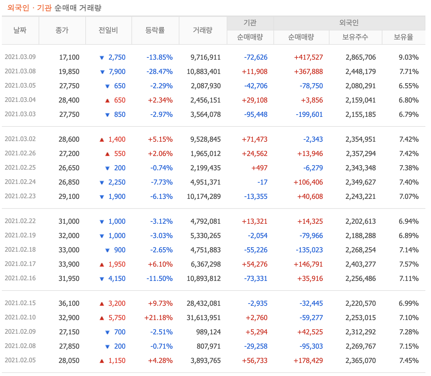 이번 급락에서 흥미로운 점은 외국인의 매수세입니다. 3월 8일~9일 양일간 외국인은 약 80만 주를 순매수하며 강력한 매수세를 보였습니다. 6.55%였던 보유율은 9.03%까지 치솟았습니다.