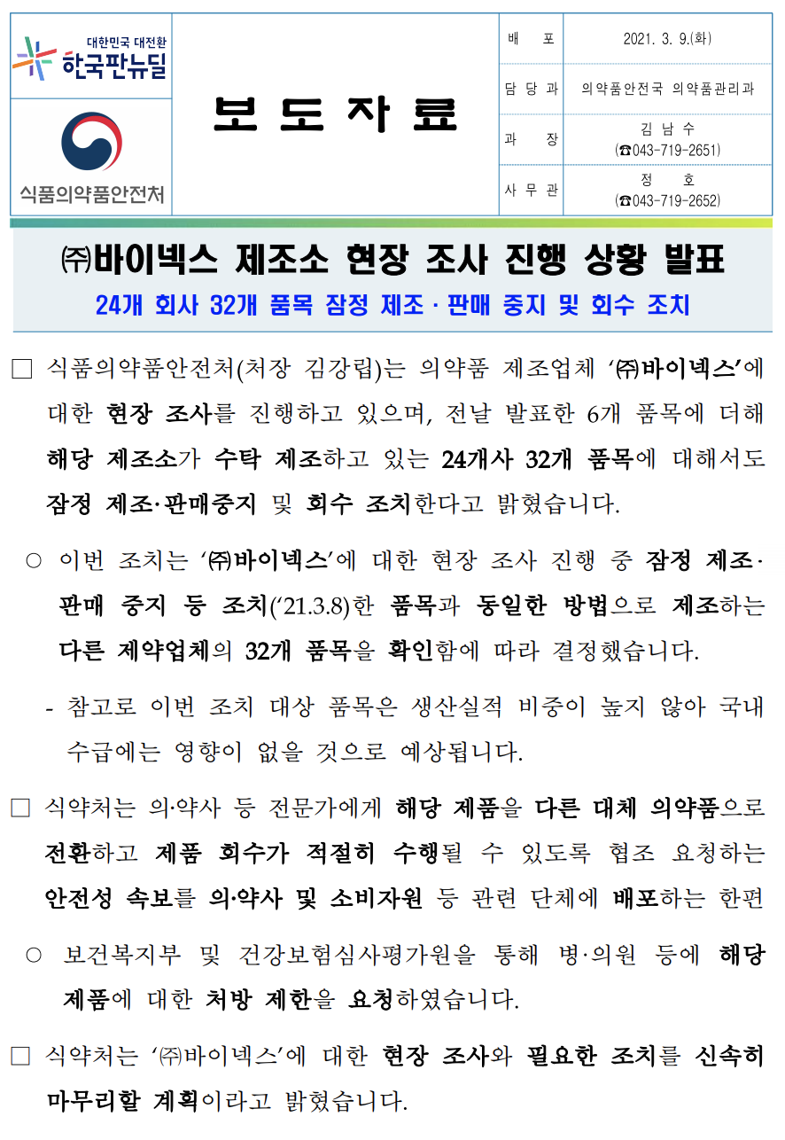9일에는 추가로 24개사 32품목에 대해 조치를 취했는데, 이는 새로운 것에 대한 조치가 아니라 8일 조치가 취해진 바이넥스의 6품목이 제약사마다 다른 이름으로 판매되고 있어 32품목으로 확대된 모습입니다.