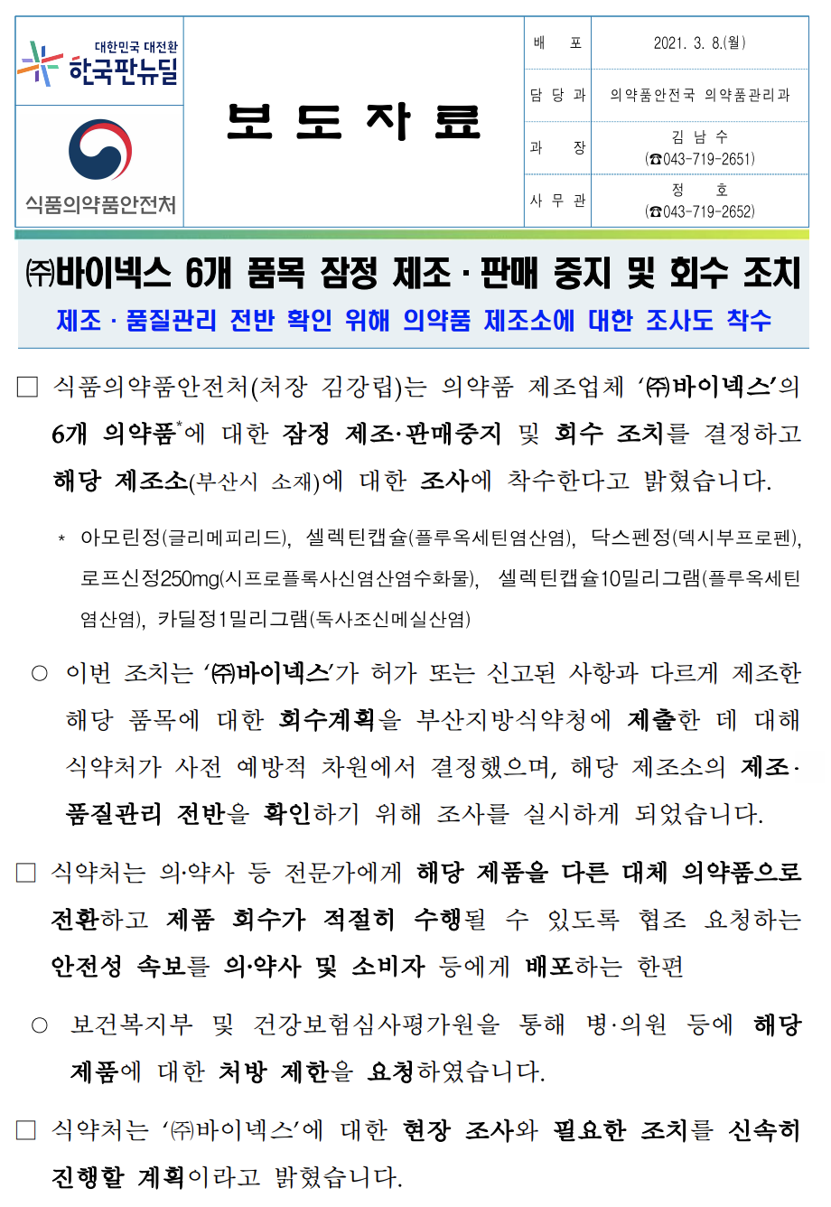 바이넥스는 허가 사항과 다르게 의약품을 제조해 지난 8일 관련 6개 품목이 잠정 제조, 판매중지 및 회수 조치 되었으며, 9일 관련 24개사 32품목에 대하여 추가 조치가 들어가는 일이 발생했습니다.