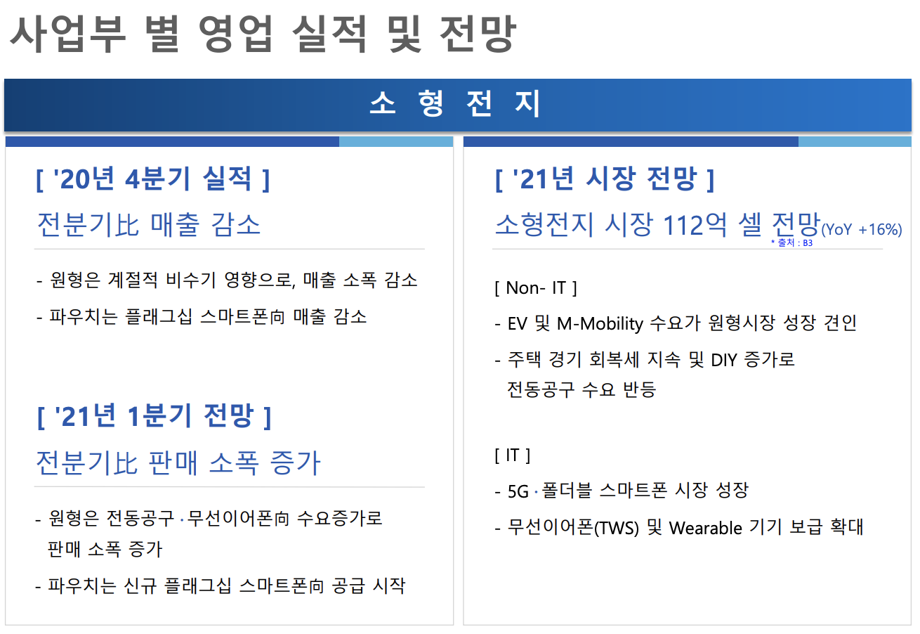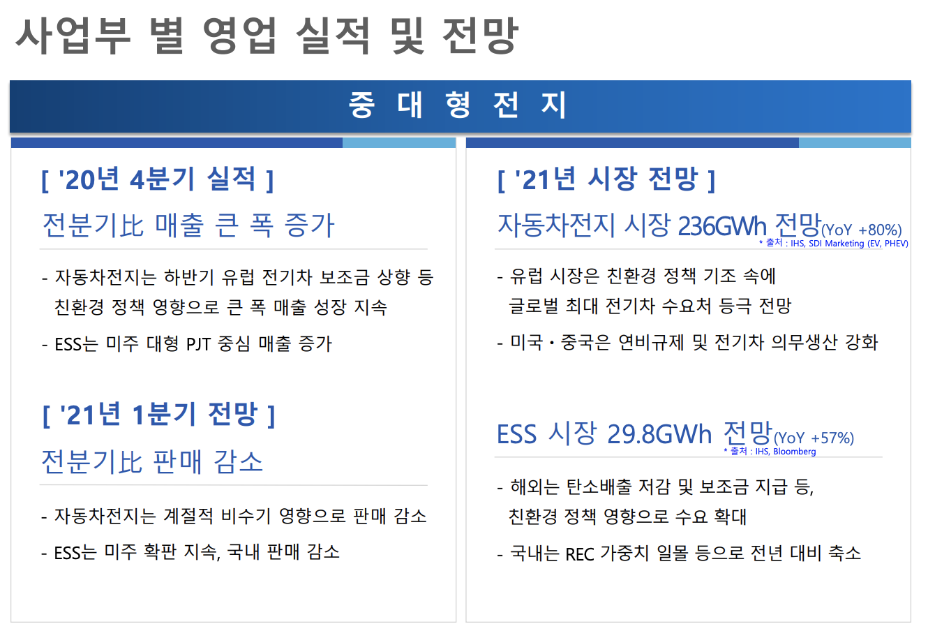 LG화학(LG에너지솔루션)은 코나 EV 리콜 문제, SK이노베이션은 LG에너지솔루션과의 배터리 분쟁 등 수익성이 악화될 수 있는 이벤트들이 있으나 삼성SDI의 경우 4분기 실적 컨퍼런스콜에서 1분기가 비수기임에도불구하고 BEP 수준의 손익을 기록했을 것이라고 말했습니다.