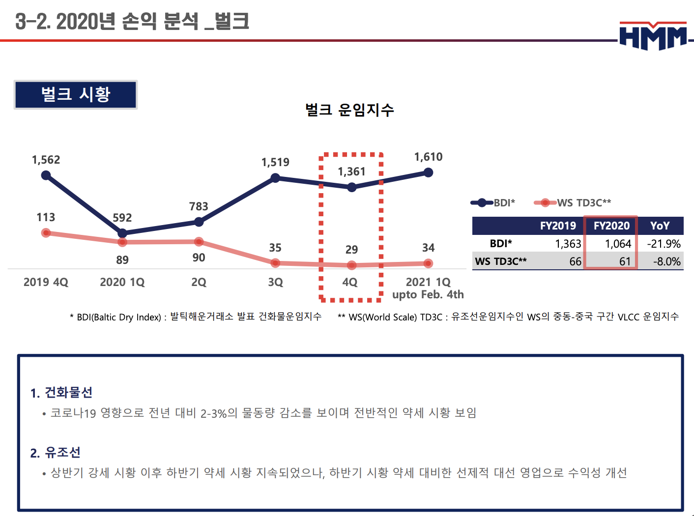 HMM의 4분기 컨테이너 수송량이 전년동기대비 10.6% 증가한 1,067TEU를 기록했으며, TEU당 평균 수익은 전년동기대비 무려 55.8% 증가한 $1,523을 기록하며 실적을 이끌었습니다.