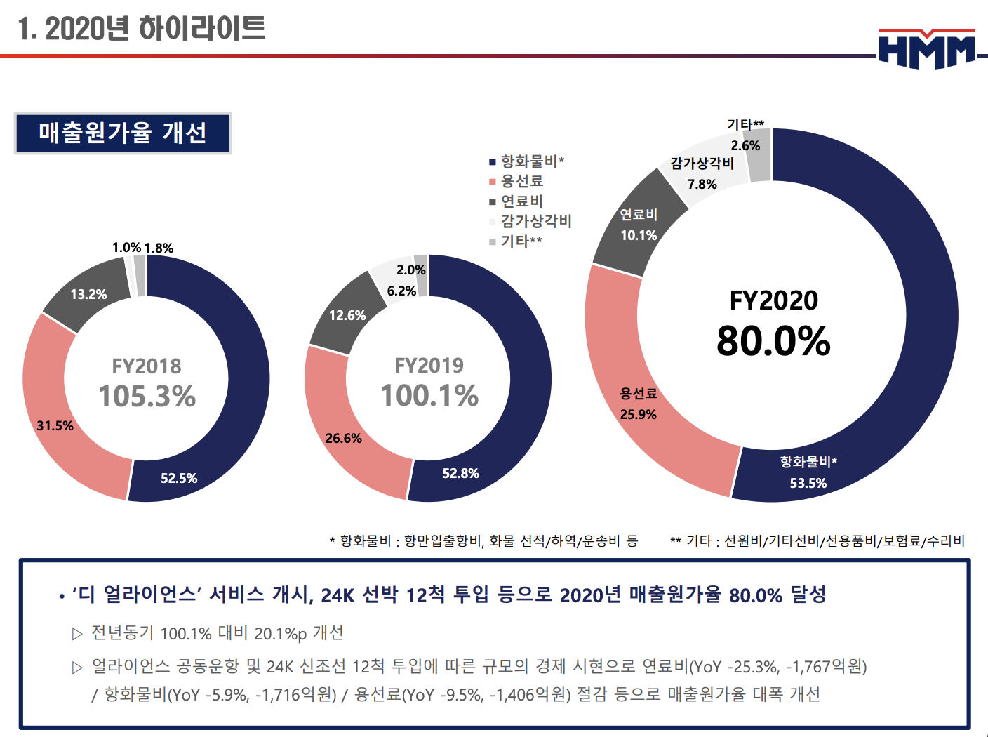 2019년 세계 3대 해운동맹 중 하나인 디얼라이언스에 가입한 HMM은 2020년부터 독일 하팍로이드, 일본 ONE, 대만 양밍 등 3개사와 협력해 선복량을 늘리고 서비스 노선도 확대하면 체질 개선에 나섰습니다.