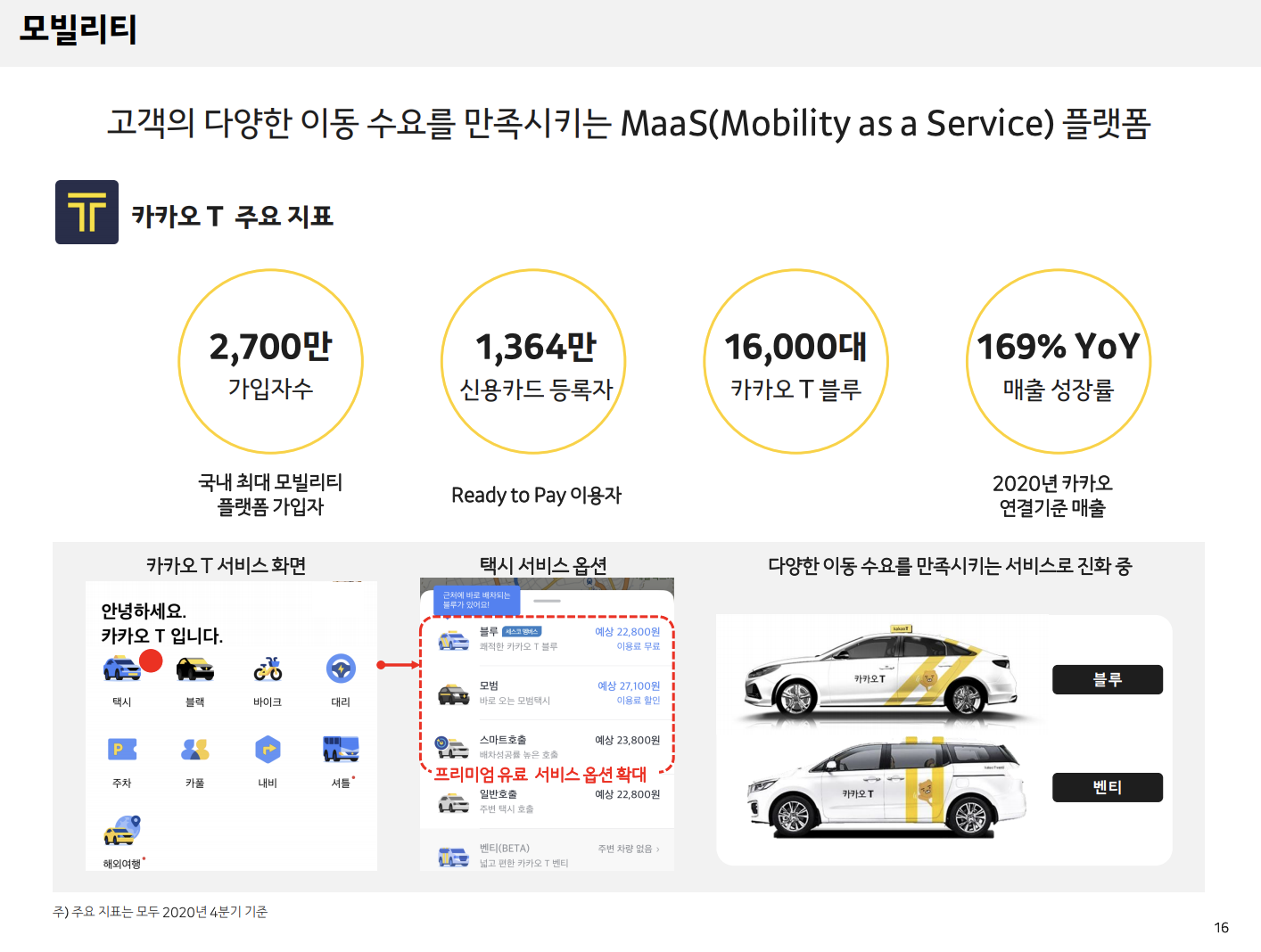 카카오 T블루의 성장세도 돋보이고 있습니다. 국내 전체 브랜드 택시 중 52%가 카카오T블루입니다. 2020년 4분기 16,000대에서 2021년 4분기 30,000대까지 운영 대수를 확대할 계획이며, 이와함께 가파른 매출 신장이 일어날 것으로 전망되고 있습니다.