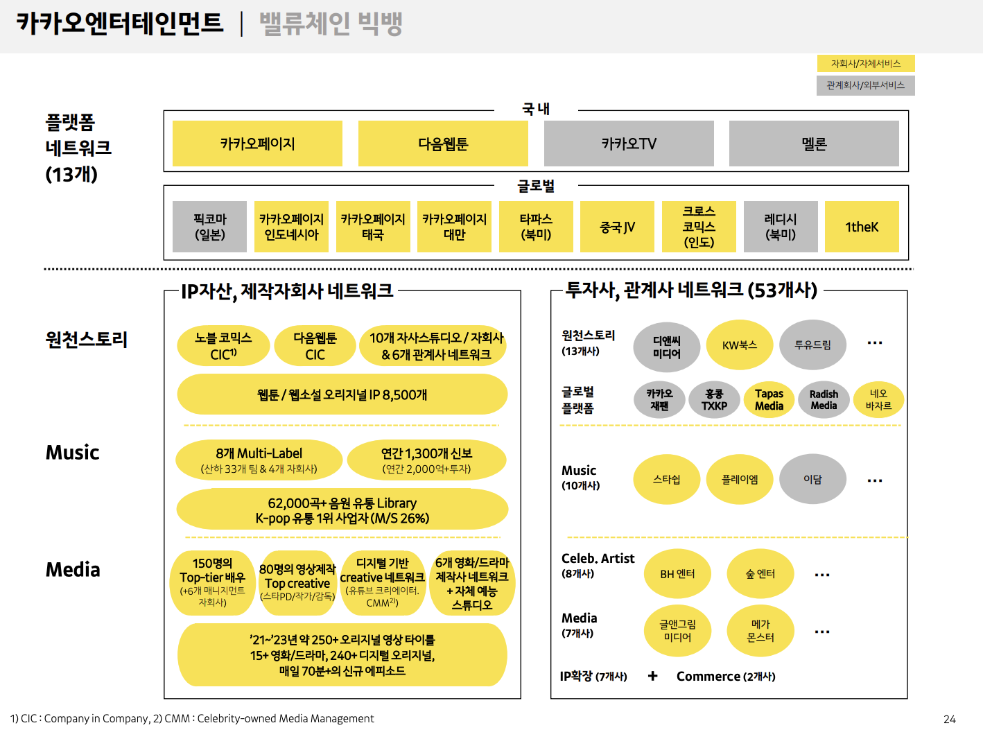 카카오엔터테인먼트는 카카오페이지, 카카오M을 결합하며 'IP(카카오페이지) - 매니지먼트 - 영상제작 - 카카오TV, OTT플랫폼' 모습의 콘텐츠 벨류체인을 구축하는 모습을 보였습니다.